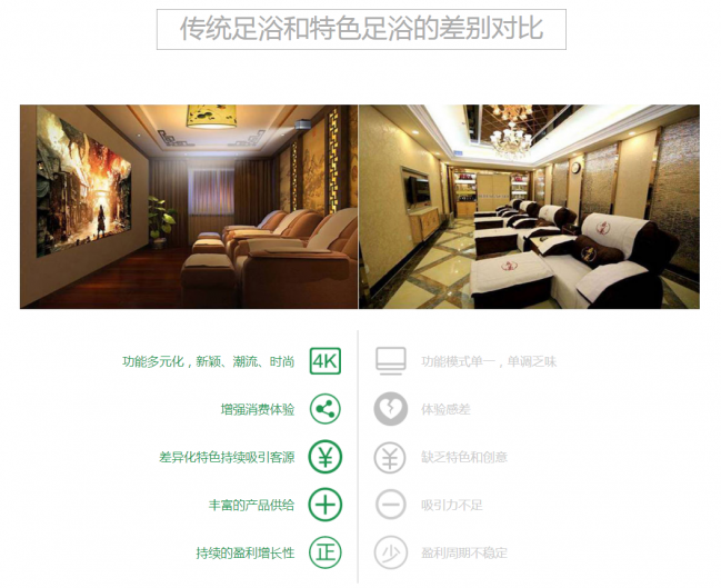 足浴作为一个传统服务行业,目前已基本处于饱和状态,行业经过多年的高速发展,逐渐开始步入缓慢甚至迟滞的发展阶段。当前消费升级的大背景下,传统足浴店亟待转型升级,如何寻找保证服务质量与成本节约之间的平衡,打造出具有差异化和个性化的主题和服务是传统足浴店当务之急的课题——影院式足浴无疑是一个很好的选择。
