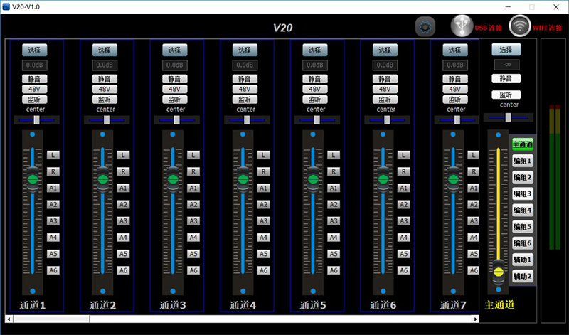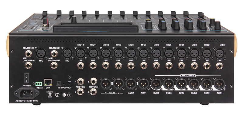 1:20路信号输入(12路MIC、2组立体声、1组返回、声卡/MP3+光纤)