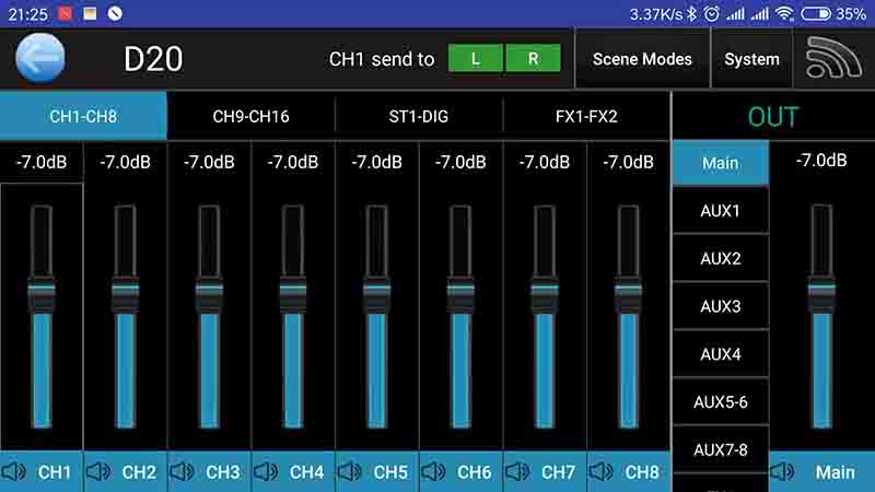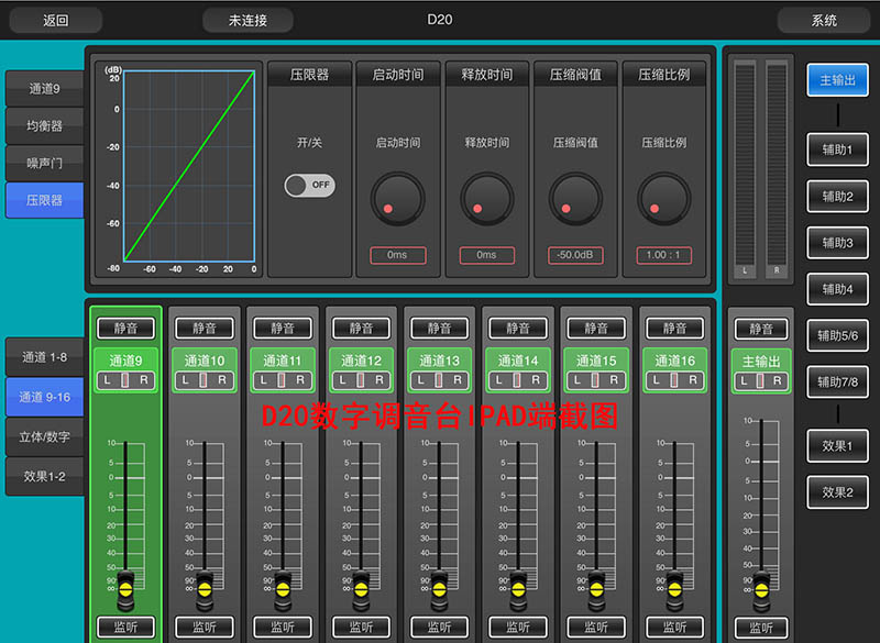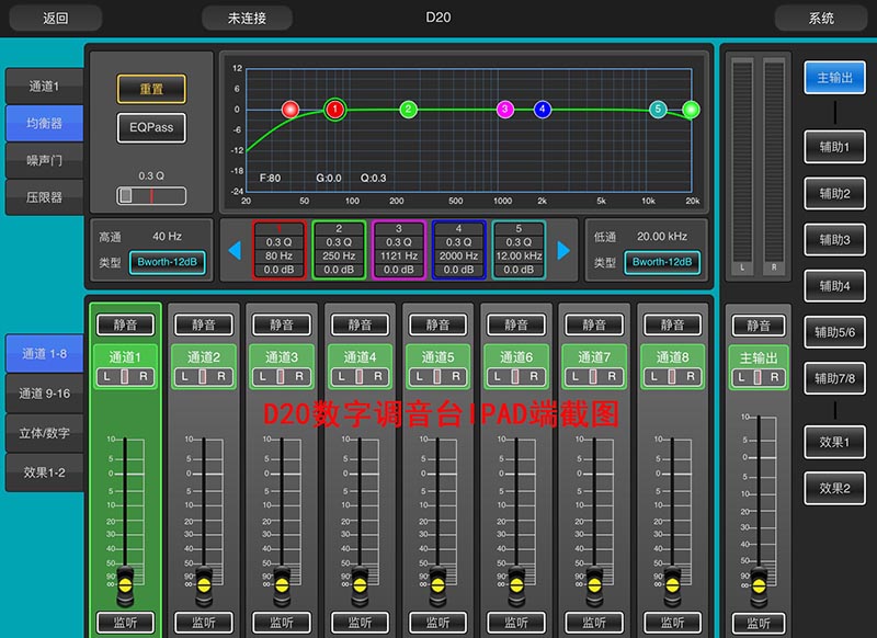通过ipad APP可对D20进行所有操控,包括增益,EQ,动态,推子