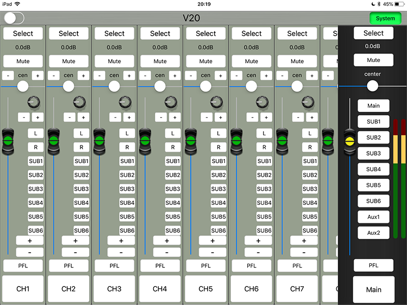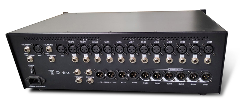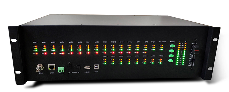 1:20路信号输入(12路MIC、2组立体声、1组返回、声卡/MP3+光纤)