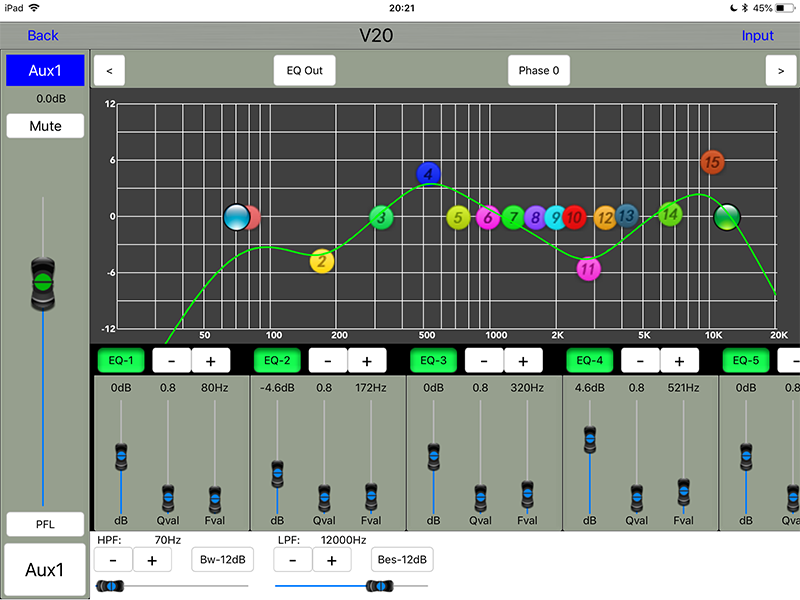 输出15段全参量均衡:20-20kHz,+/-12db,