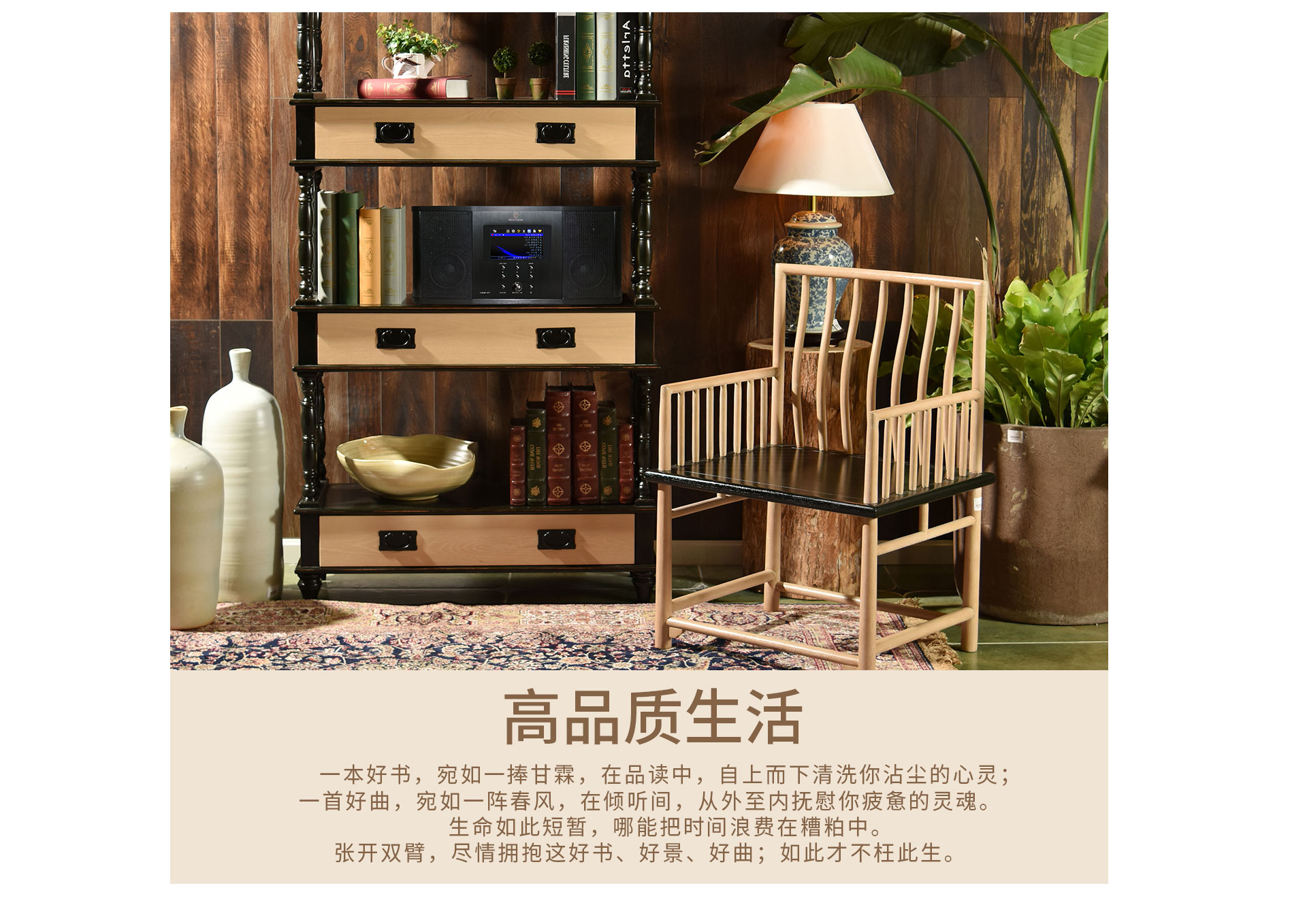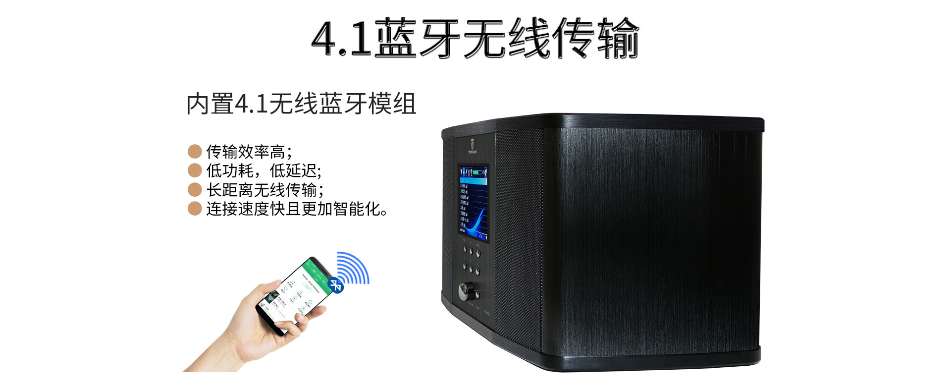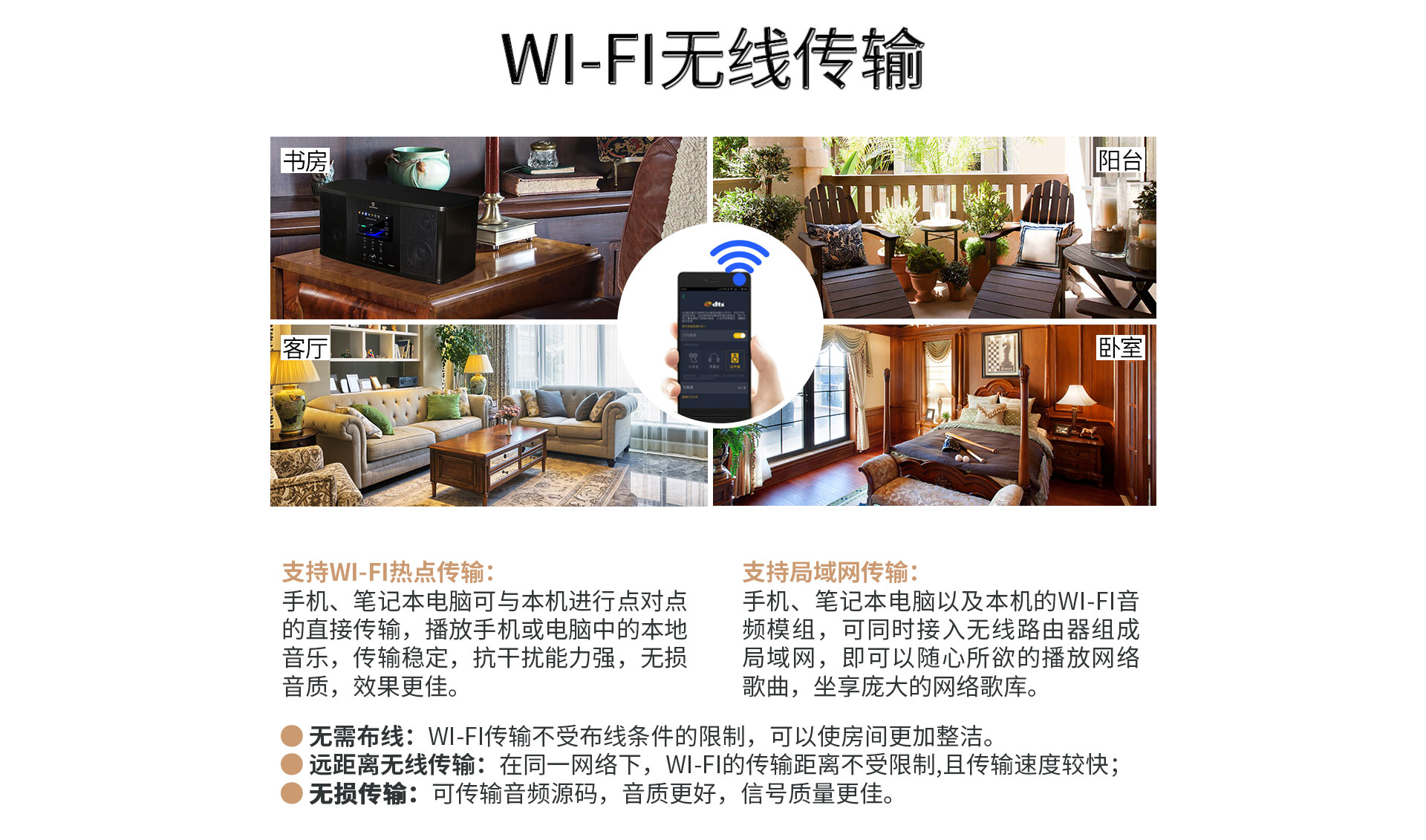 三、主要功能表述 可连接多种设备:手机、IPAD、笔记本、台式电脑、蓝牙、SD卡、U盘、CD机、功放。 支持WIFI热点传输:可进行点对点的直接传输,播放手机或电脑中的本地音乐,传输稳定,抗干扰能力强,无损音质,效果更佳。WI-FI无线音频传输具备AP模式(热点直连模式)和net模式(局域网模式)2种工作方式。 无需布线:WI-FI传输不受布线条件的限制,可以使房间更加整洁。 传输速度快:WI-FI的传输速度远超蓝牙传输,传输品质高:可传输音频源码,音质更好,信号质量更佳。 支持局域网传输:手机、笔记本电脑以及本机的WIFI音频模组同时接入无线路由器组成局域网连接的方式,可以随心所欲的播放网络歌曲,坐享庞大的网络歌库。