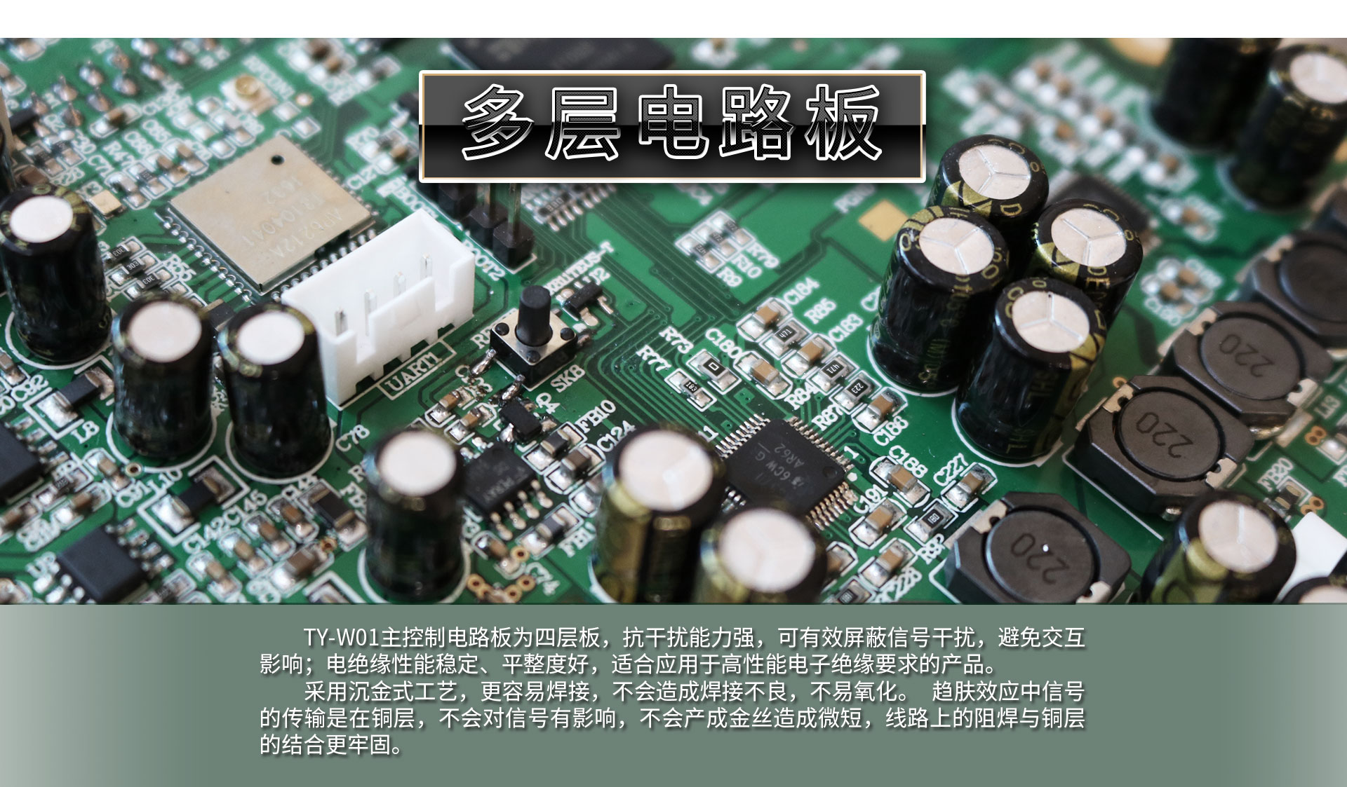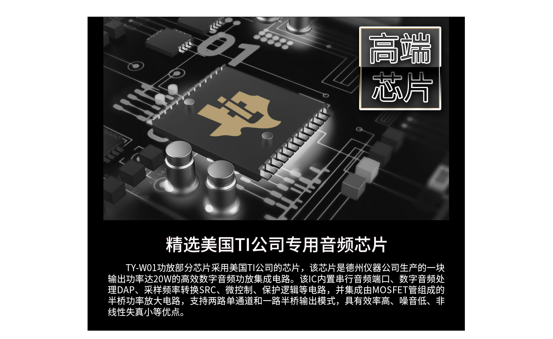 二、电路及用料设计 TY-W01主控制电路板采用四层板,沉金式工艺,电路的传导性更好,失真率更低。功放芯片采用集信号处理与功率为一身的TAS5711芯片,此芯片为美国德州仪器的高精度芯片,质量稳定,运算速率高,品质更好;采用AP6212A无线数字模块,无线信号接收更加稳定,效率更高,不易出错;核心控制部分器件电路采用BGA球状引脚栅格阵列封装技术,高密度表面装配封装技术。BGA封装技术使每平方英寸的存储量有了很大提升,采用BGA封装技术的内存产品在相同容量下,体积只有TSOP封装的三分之一;与传统TSOP封装方式相比,BGA封装方式有更加快速有效的散热途径。 该机最重要的蓝牙处理芯片采用了炬芯旗舰蓝牙音频芯片ATS2825。ATS2825是针对中高端蓝牙市场设计的高性能蓝牙V4.2双模蓝牙音频解决方案Soc,高度集成MCU、DSP和RF在一颗单芯片中,体积虽小但内功深厚,在保证高品质音乐播放的同时仍保持低功耗的特点。