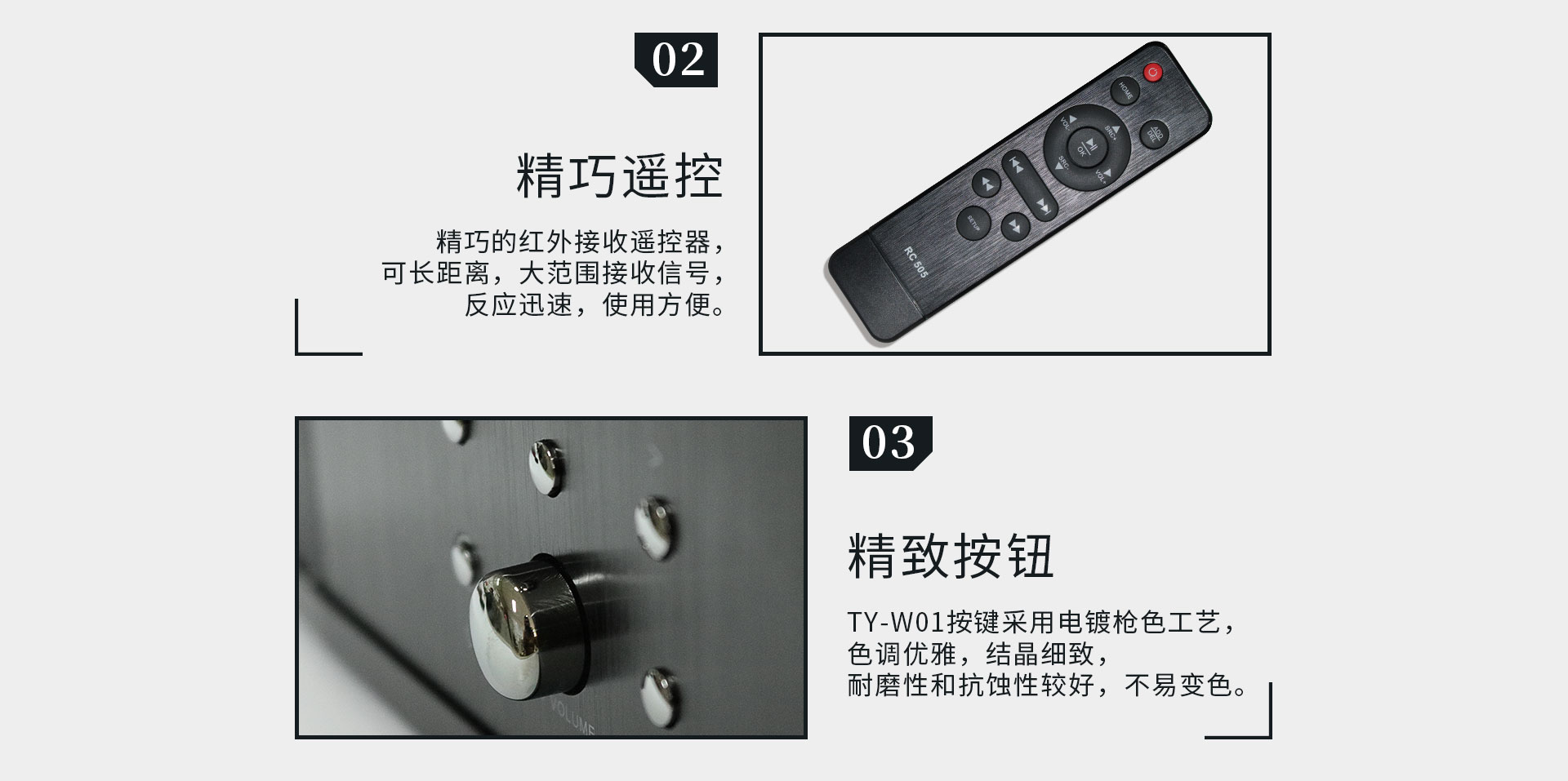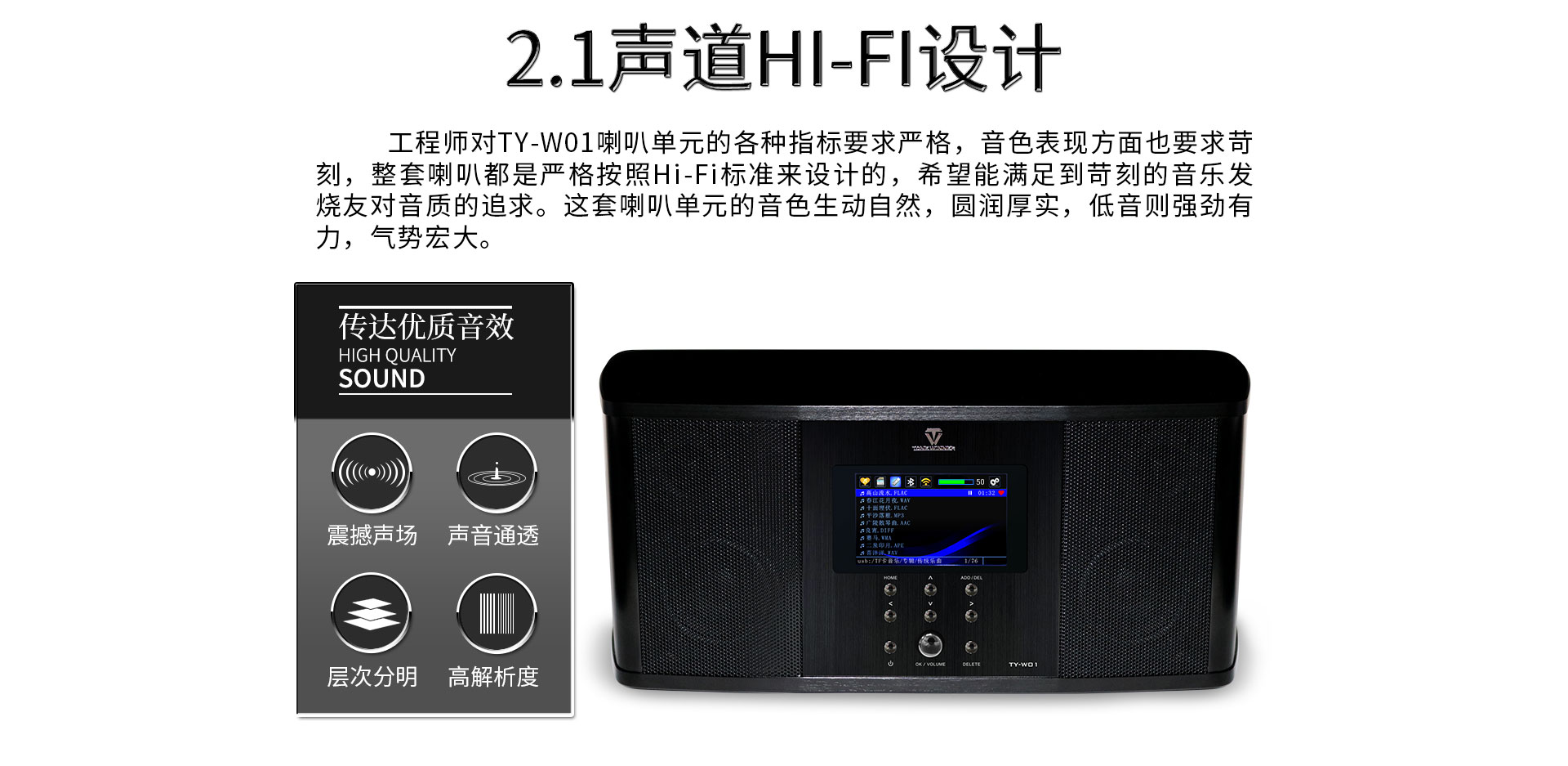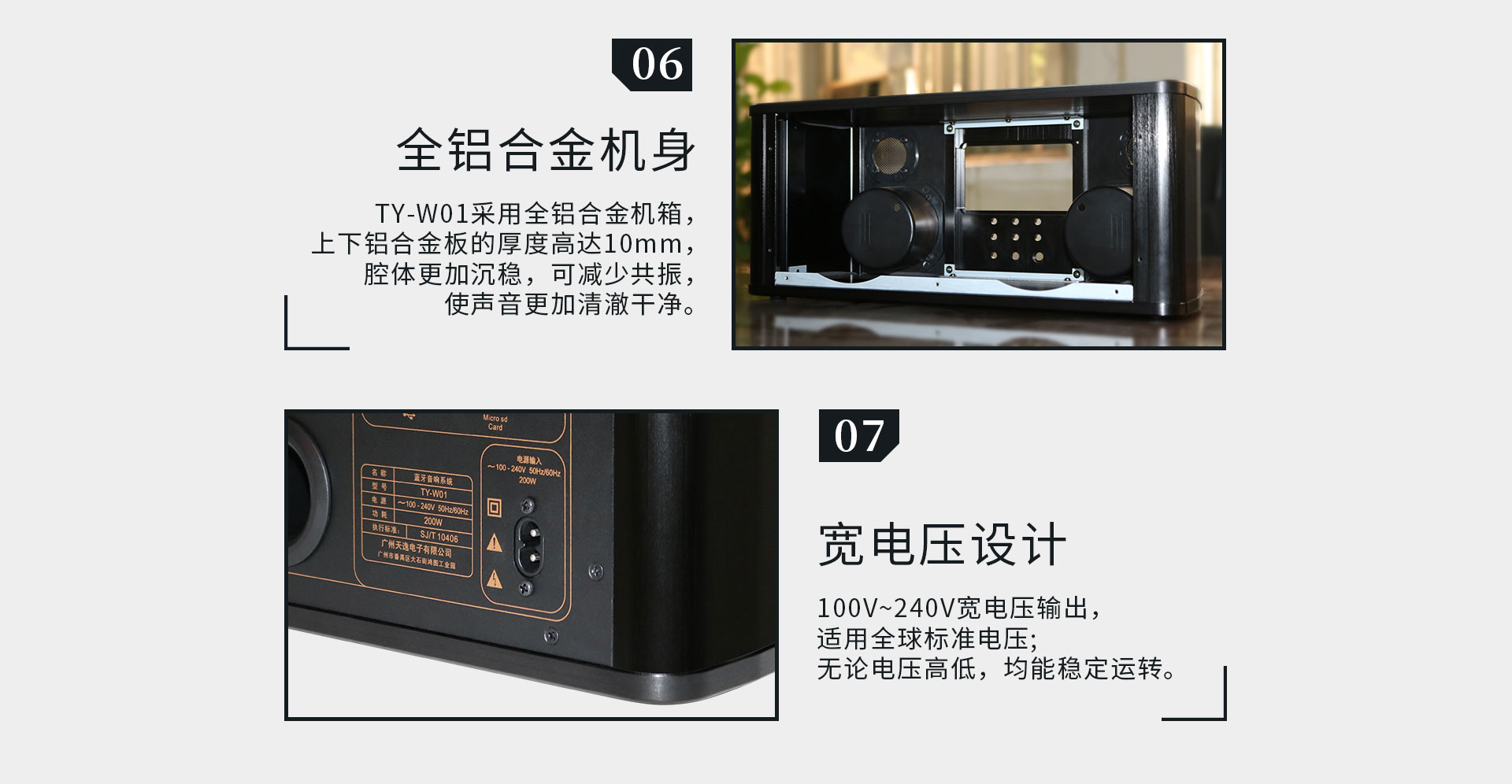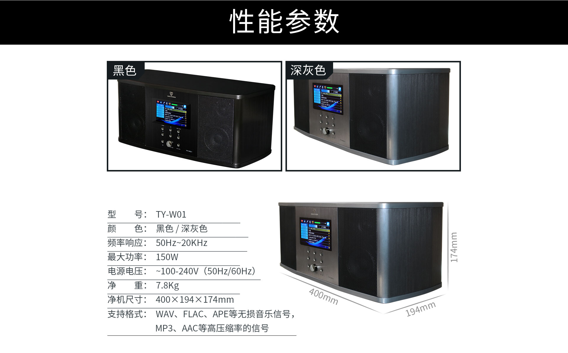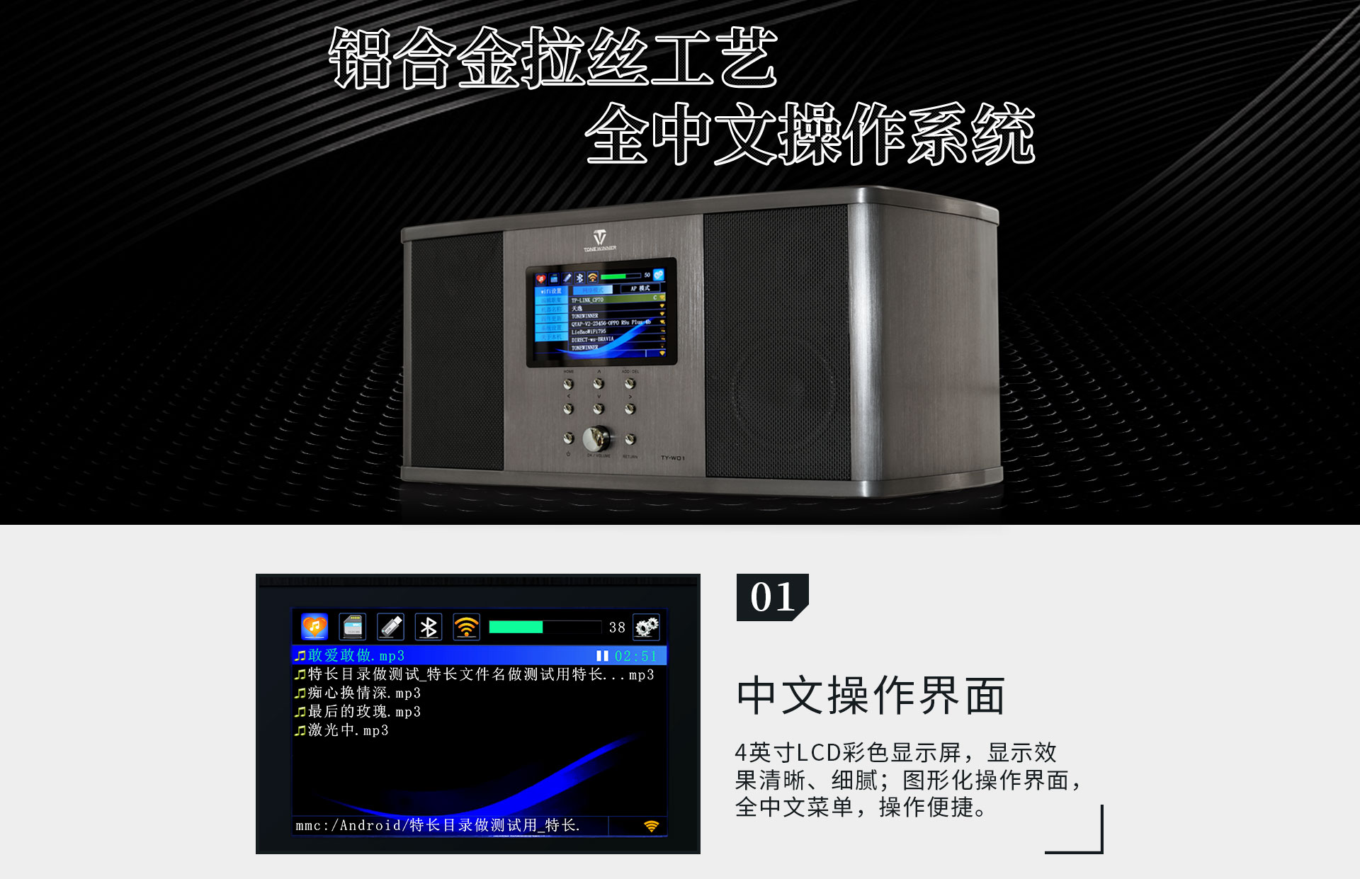 一、外观特点 TY-W01外观全部采用全铝合金,上下铝合金的厚度高达10MM,采用工业拉丝阳极氧化处理,质感强烈,整个腔体更加沉稳,能够避免腔体共振,声音清澈干净,并且耐脏,不易留指纹。采用4寸真彩屏,彩色图文显示,并且颜色更加鲜艳;感受现代科技感带来更高品质生活,