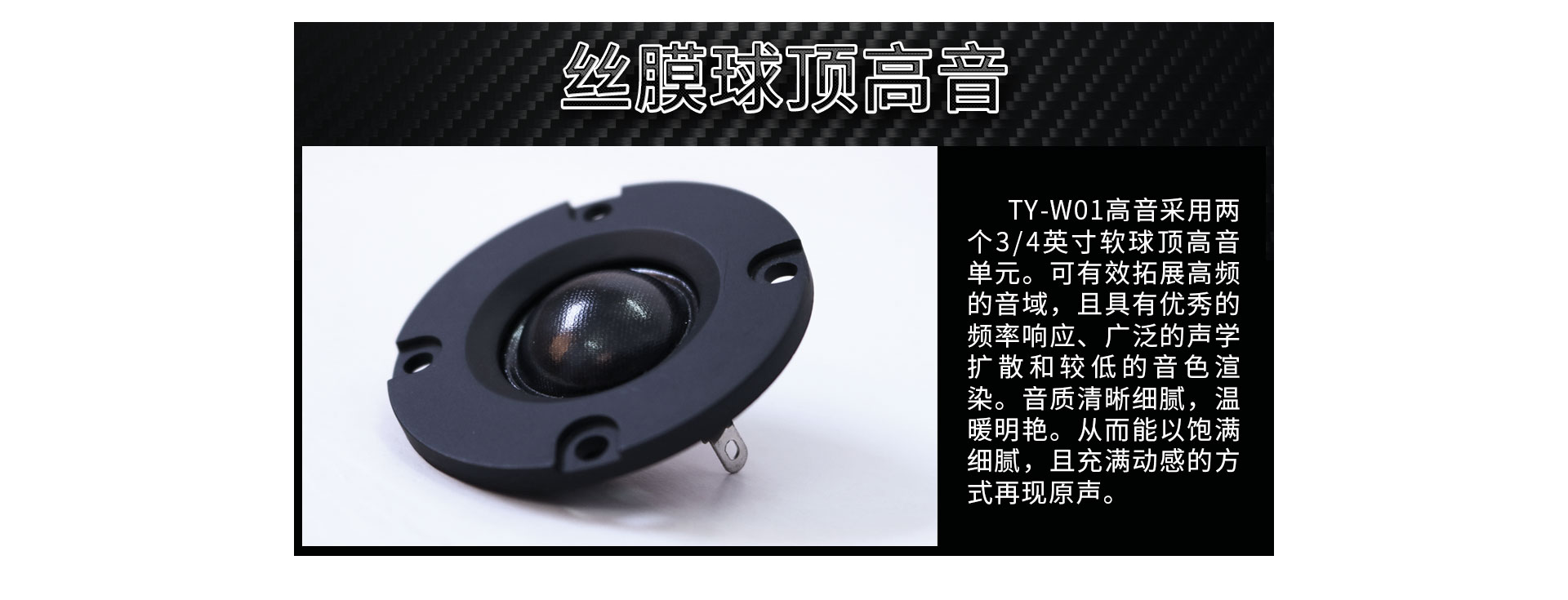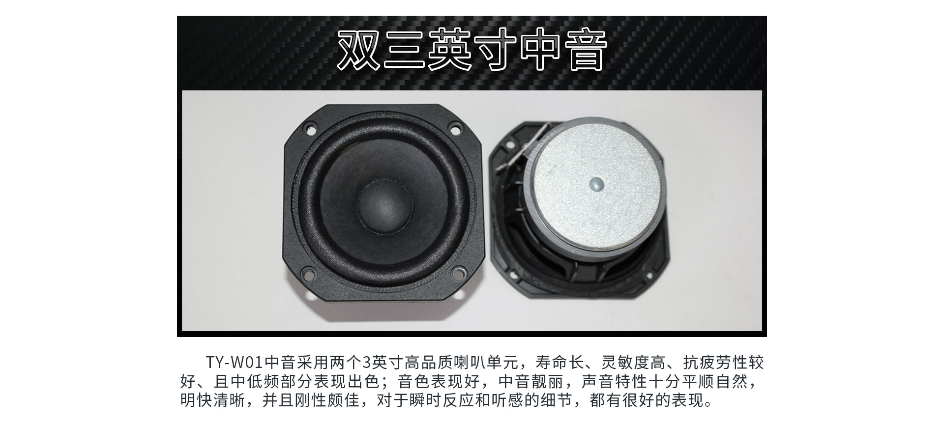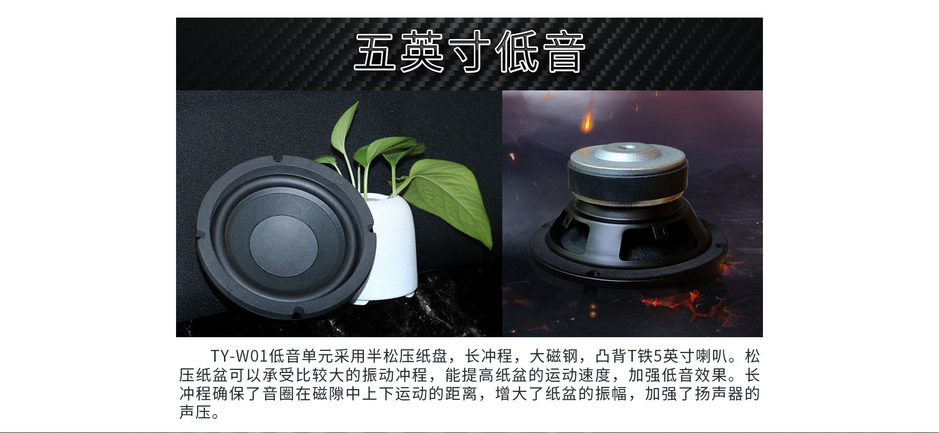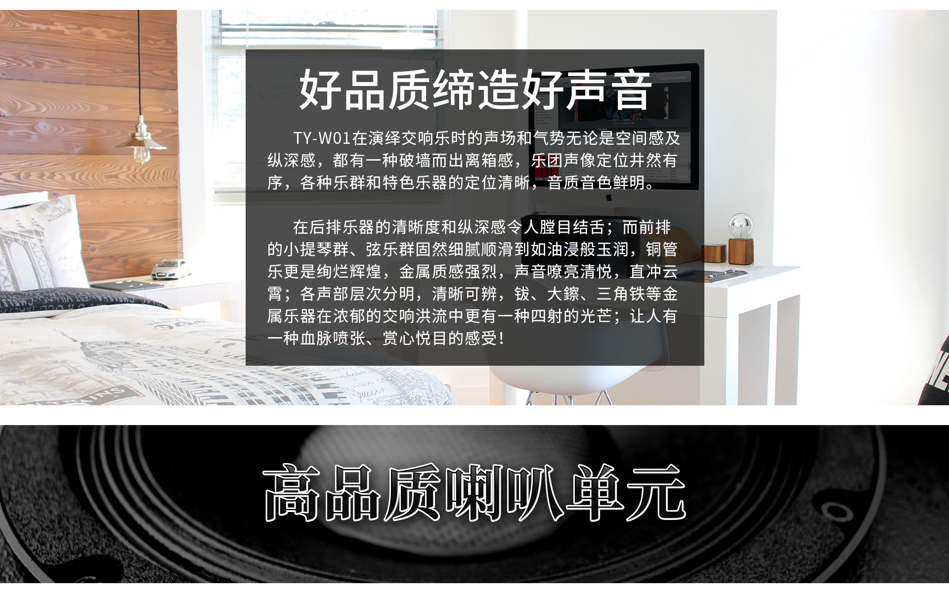 四、声音特性 TY-W01高音音质清晰细腻,温暖明艳。从而能以饱满细腻,且充满动感的方式再现原声。中低频部分表现出色;音色表现好,灵敏度高,中音靓丽,声音特性十分平顺自然,明快清晰,并且刚性颇佳,对于瞬时反应和听感的细节,都有很好的表现;低音部分音质细腻、宏亮、失真小低音量感足。