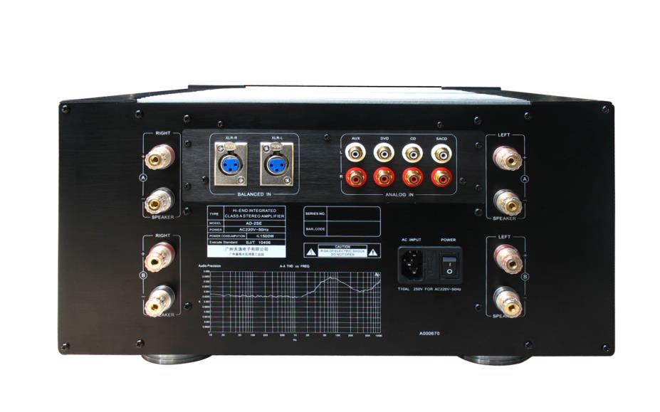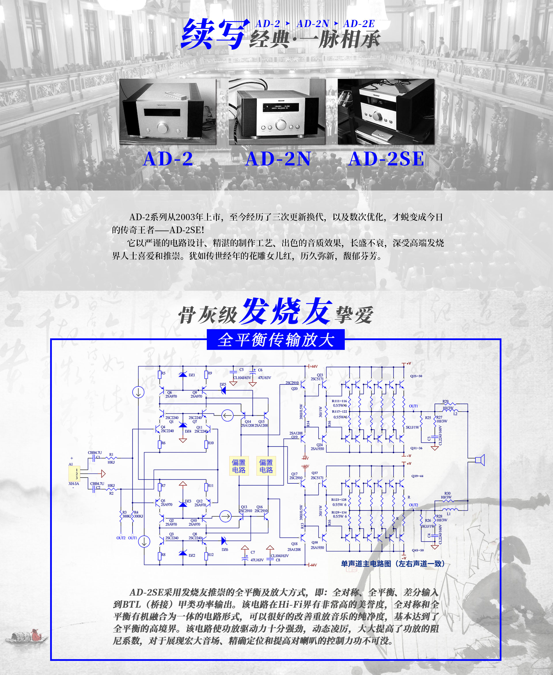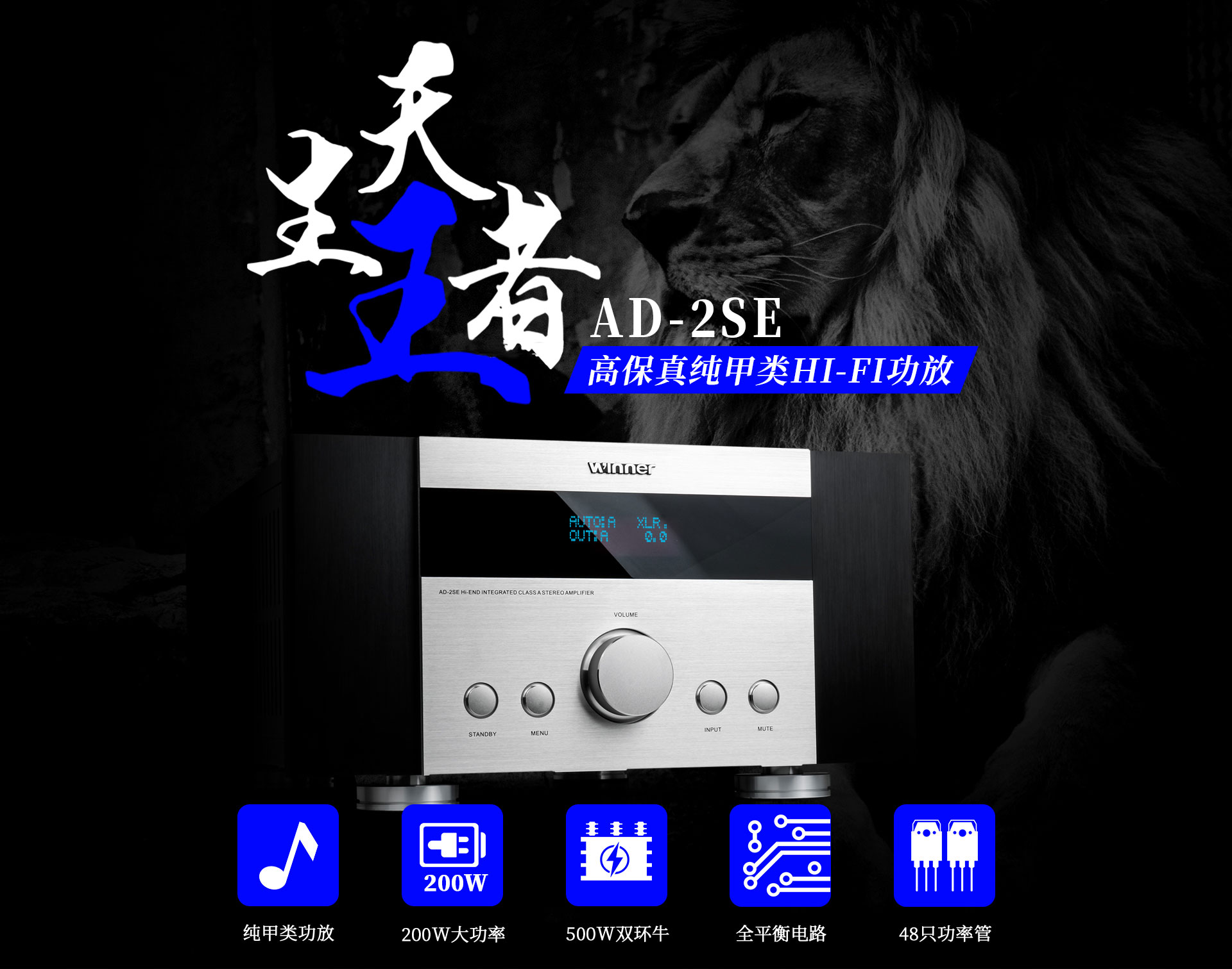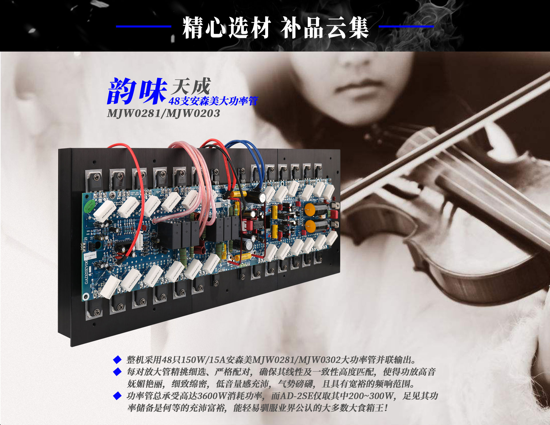 <span line-height:2;"="" style="font-size: 16px;"> 一、外观特点 简洁流畅的金属线条,全身披挂的黑白色铝合金铠甲,标志性的近百斤的体重,很好的诠释着纯甲类的特征。而硬朗挺拔有如西楚霸王的高大威猛,细腻温润的湖蓝色液晶点阵数码显示屏,又让这铁甲硬汉平添了几许温润的柔情,更让有纯甲情结的音响发烧友们一见钟情。 二、电路及用料设计 AD-2SE总共有5大块电路板,从头至尾为电源整流滤波大水塘(容量大的电容)、左右声道放大电路板、输入前级放大电路板和整机显示控制板,各部分电路板分别安居于各自的屏蔽空间,工艺整洁,视觉效果相当清爽!机器前部两个600W的环型电源变压器相对而坐,以获得整机的重量平衡并为甲类电路提供强劲的能力之源。 居于整机正中央的主电源板,12只12000μF/63V的MARCON滤波电容和带散热器的整流全桥堆,采用了整齐的矩阵式对称排列手法布局,无论在体积、重量和色彩搭配上,都让人眼前一亮:颇具有份量而阵容精锐、蔚然壮观。 该机的前级为获得最佳的信号切换分离度,选用了高度密封的无音染继电器作为音源切换,并特别选用了优质全密封防尘电位器作为音量控制,在最易受到干扰的音量开关和讯源切换部分,则施以全金属罩屏闭。从而使得整机的抗干扰能力、信噪比等关键指标,得以最大限度的提高。 电路上,AD-2SE为确保最佳的音质音色和尽可能高的信噪比指标,前级放大不惜成本选用了当今倍受好评的美国原装靓声运放OPA2134,并采用了双4脚镀金插座连接形式,以方便发烧友日后的摩机升级换代。后级放大输入级采用了镜像菱形对称差分输入方式,并在电压放大级采用了著名的CASCODE电路及恒流源负载,从而能令信号的相移减至最小、频率响应宽阔。末级的功率输出级,左右声道各选用了12对150W的安森美MJW0281A/MJW0203A大功率管(整机共用了48只)并联输出! 用料、制作方面,除上述之外,机内所有的电阻均选用优质五色环金属膜电阻。在可能影响音质的主要通道,则选用了备受好评的优质MKP聚丙稀电容。其余如电压放大和电流放大、独立分别供、不超过3%误差的功率管精密配对、远离大电流的弱信号隔离技术等,均为Hi-Fi的大手笔。