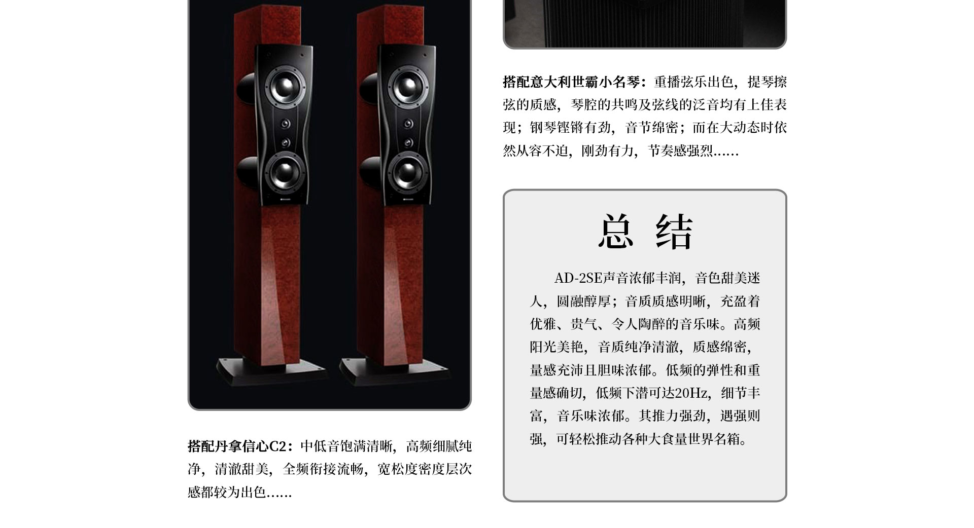 四、声音特性 播放《长发妹》、《蓝雨衣》、《民歌蔡琴》等女声时,AD-2SE将克里斯泰尔·盖尔(Crystal Gayle)的歌声表现得非常纯净澄彻,非常富于磁性;伴奏的吉它、钢琴、SAX声音通透见底。与Crystal Gayle晶莹通透的歌声相映生辉;而在播放《蓝雨衣》时,詹尼芙.袄妮斯的声音被极为准确的还原成明亮而温暖,独具魅力的发烧女声。至于蔡琴:AD-2SE所表现出来的声音是我再熟习不过的声音了,这种声音我在AD-3上早已耳熟能详:醇厚、磁性、质感、清晰、沧桑……四种音箱,各有韵味,绝对没有推不动得遗憾发生。