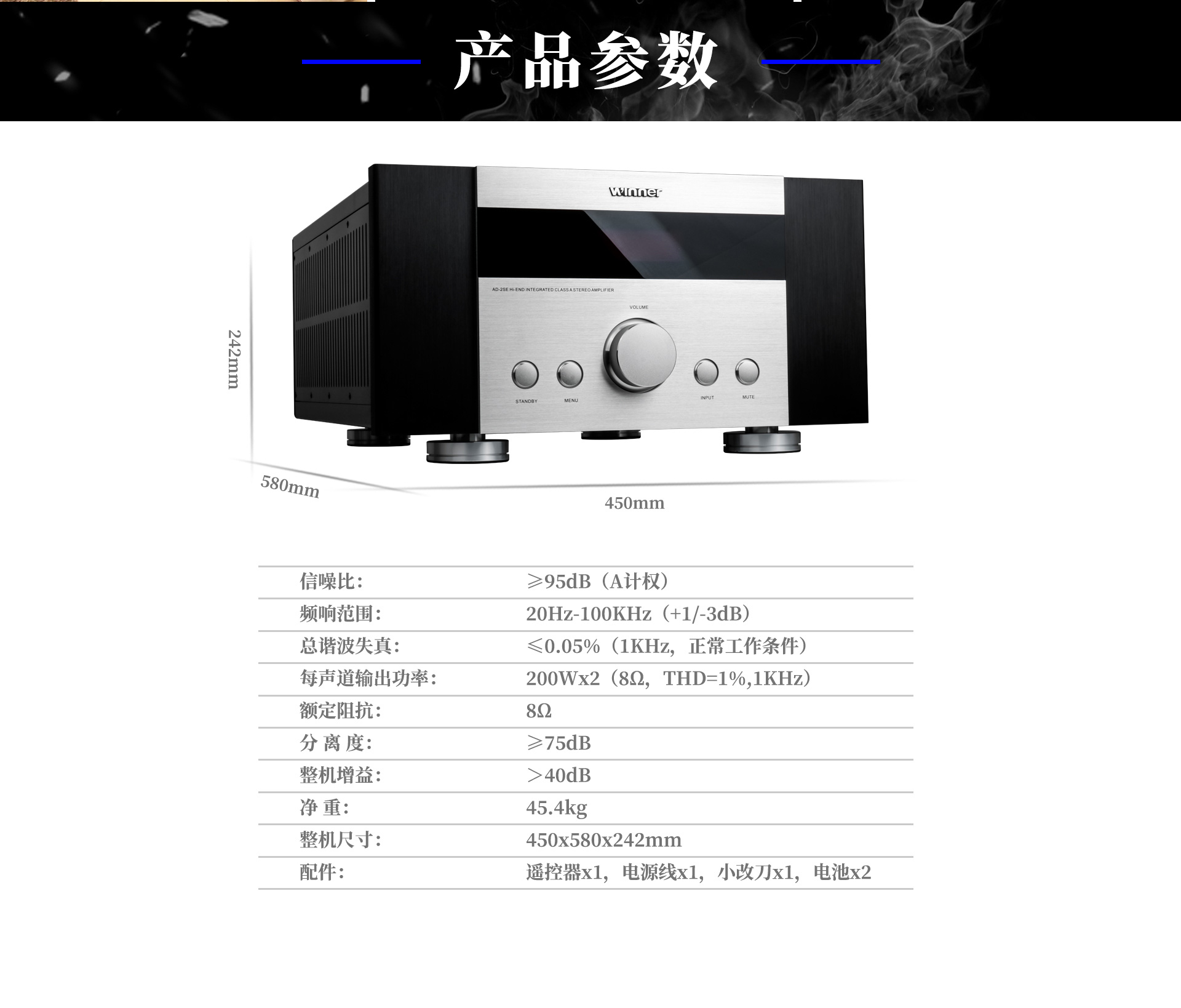 五、产品主要性能指标 声 道 数:2 信噪比:≥95dB(A计权) 频响范围:20Hz-100KHz(+1/-3dB) 总谐波失真:≤0.05%(1KHz,正常工作条件) 每声道输出功率:200Wx2(8Ω,THD=1%,1KHz) 额定阻抗:8Ω 音频解码格式:模拟两声道 视频解码格式:无 分 离 度:≥75dB 整机增益:>40dB 产品材质:铝合金 外观颜色:银色 整机尺寸:450×220(238)×530(580)mm(宽×高×深) 包装尺寸:755×432×644mm(宽×高×深) 净 重:45.4kg 毛 重:49.55kg 随机附件:遥控器X1,电源线x1,小改刀x1,电池x2 适用场合:客厅、听音室、会所、演示厅等高品质音乐的场地 |