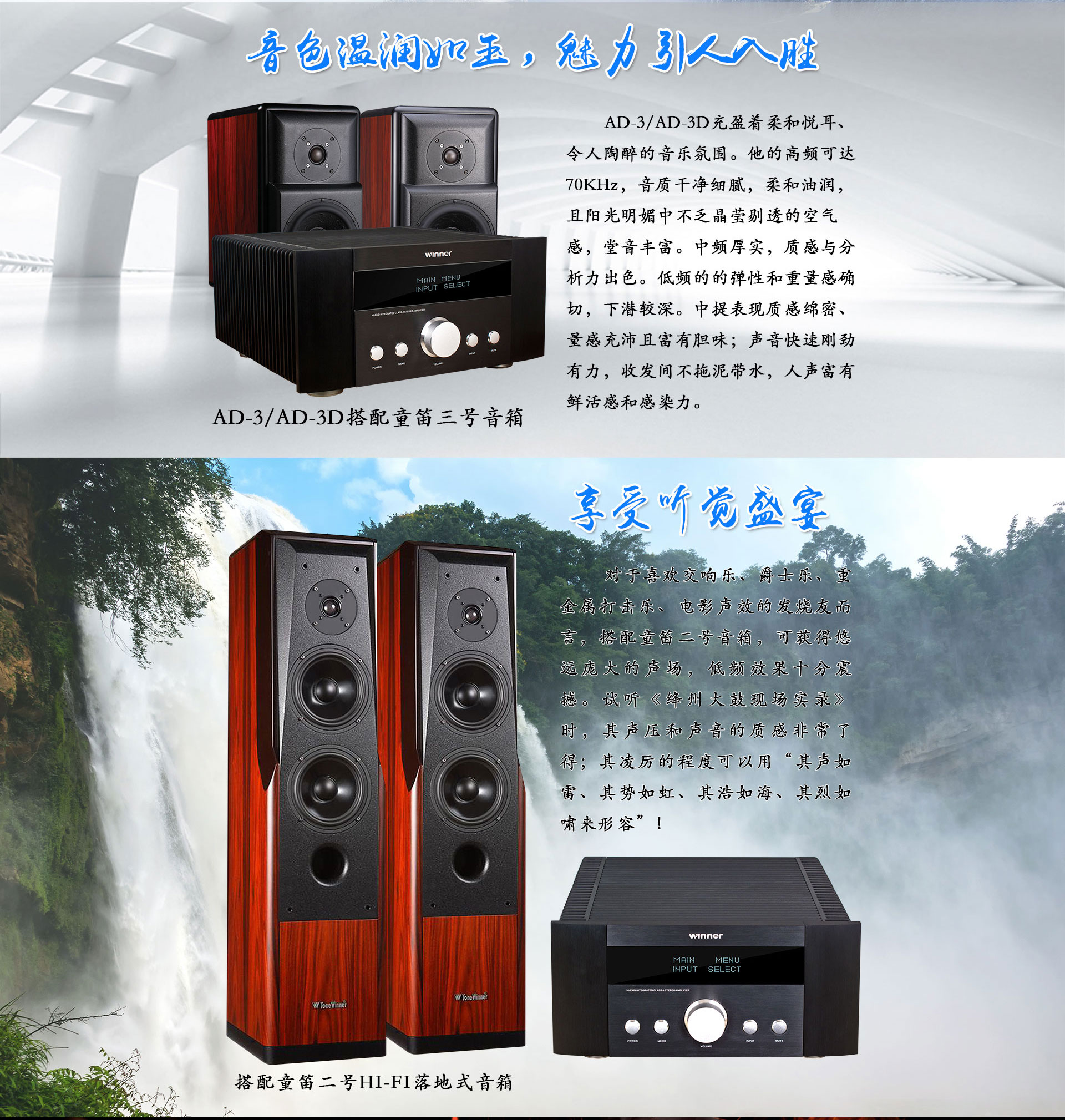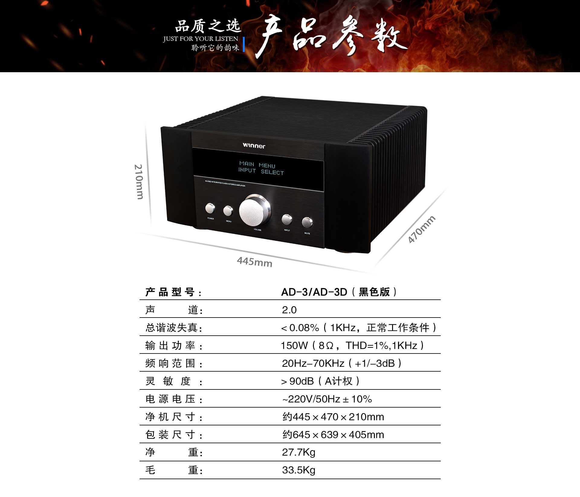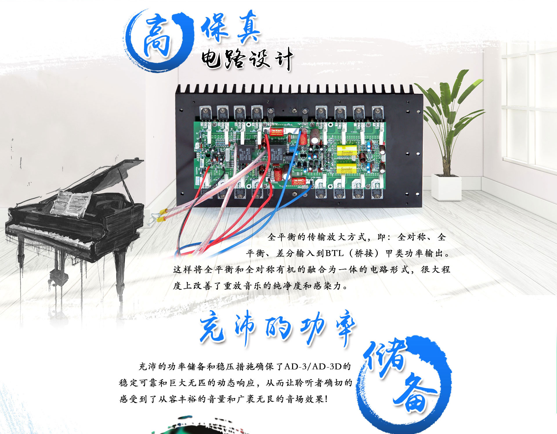 AD-3/3D(黑色版)甲类合并式Hi-Fi功放概述 AD-3DHI-END 该机与好评如潮的天逸如出一辙,其电路形式和调试标准与同样按照高标准,严要求制作,采用配对精度很高的大功率名品功放管;整机电路采用了音响界备受推崇的全平衡传输及放大方式,是一台彻头彻尾级全平衡发烧功放。——全对称、全平衡、差分输入到差分(桥接)功率输出。将全对称和全平衡有机的融合为一体的电路形式,极大的改善了重放音乐的纯净度,基本达到了全平衡的至高境界。 XHI-FI为进一步加大功率推动力,该机在推动级又特别增加了一级大电流推动电路,令输出的电流进一步加大,致使整机的推动力更加的巨大。输出级采用差分功率输出电路,这种输出电路的驱动力十分强劲,动态凌厉。它将主电压放大电路产生的正负对称信号进行充分扩流,从而形成差分输出,轻易驯服如丹拿信心系列和出名难推的、等音箱该机的每声道用了对进口大功率管(整机共用了只)!如此豪华的阵容绝非一些山寨小厂在广告中宣传的虚假平衡功放所能同日而语!而只有这种不惜成本使用双倍的器件将全对称、全平衡从头至尾有机的融为一体的电路形式,才能得到最高的共模抑制及最高的信噪比,将谐波失真“抵消”至最小程度! 三、音质特性 AD-2SE, 四、特别说明 AD-3/3DAD-3DAD-3DACD/AAD-1955DACAD-185324bti/192KHzDAC126dB!timing resolutionD/AjitterDVDCDDAC 产品型号:(黑色版) 2 90dBA整机增益:>(计权) 20Hz-70KHz(+1/-3dB总谐波失真度:<(,正常工作条件) 8每声道输出功放:(Ω),,,) 28.4Kg 33.5Kg 444×418(460)(宽×高×深) 650412644mm<span "="" style="font-size: 16px;line-height: 2">(宽×高×深) |