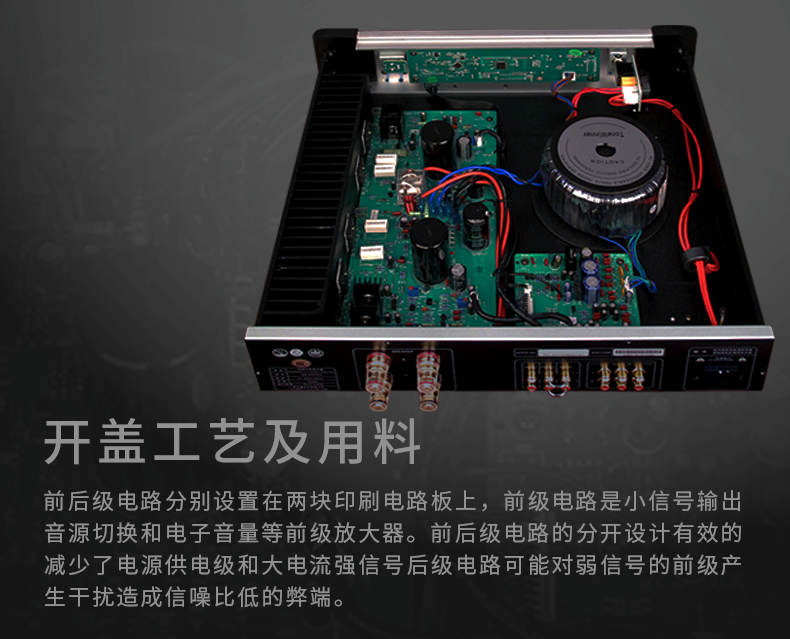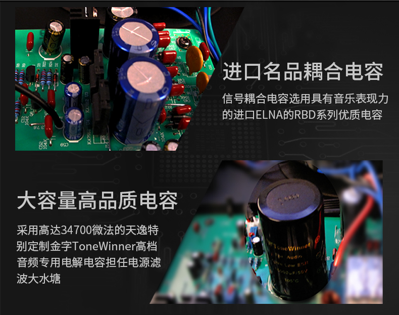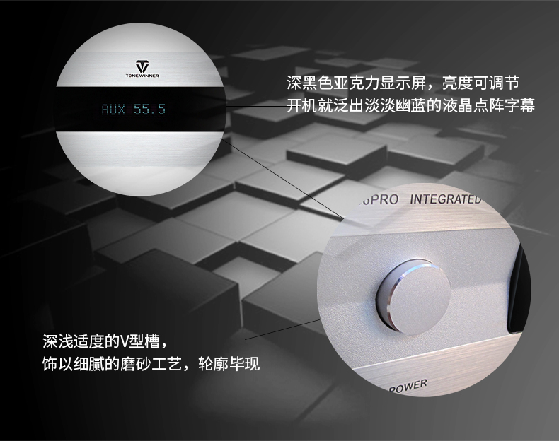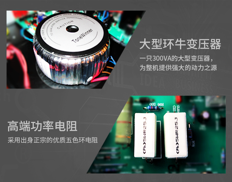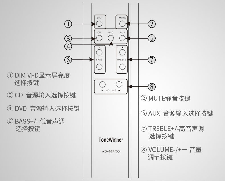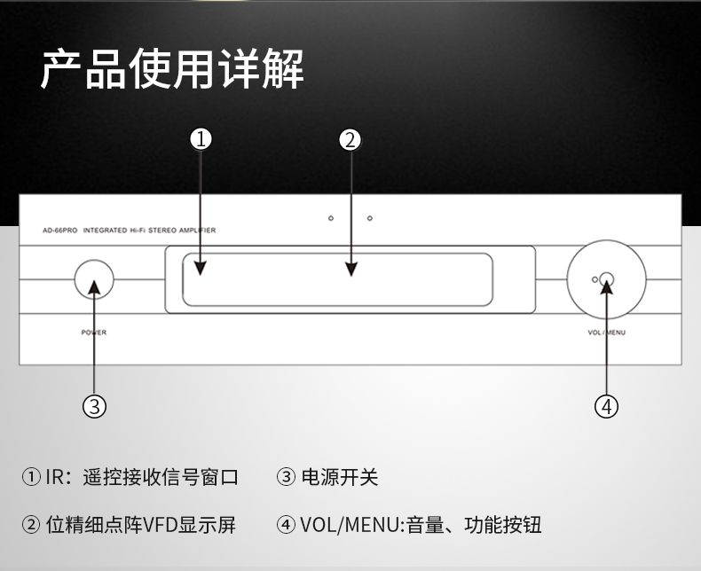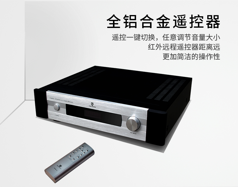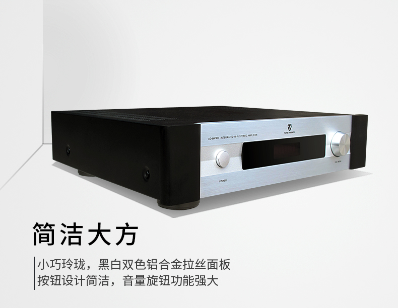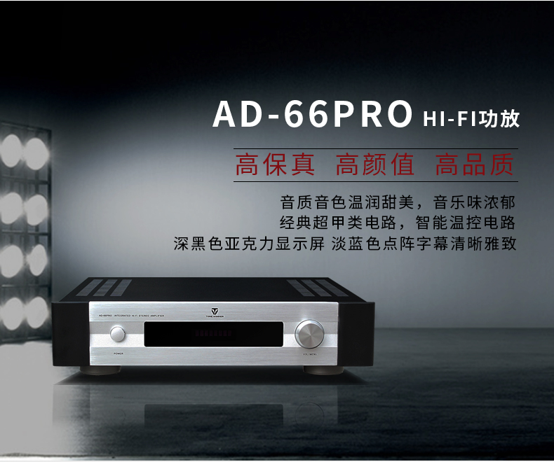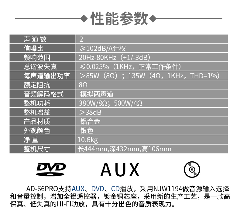 AD-66PRO超甲类HIFI合并式功放概述 AD-66PRO外观简洁大方,整体小巧玲珑。黑白双色铝合金拉丝面板,按钮设计简洁,深黑色亚克力显示屏,淡蓝色点阵字幕清晰雅致。 二、电路及用料设计 充沛的甲乙类功率输出。由于功放管任何时候都不会工作在截止区,从而不会产生乙类放大器的开关交越失真,同时因为无信号时推挽管的工作电流不是太大,又避免了甲类放大器的发热量太大的缺点,可谓一举两得。该电路经过在天逸高保真功放中长期使用和不断的调整,其稳定性和可靠性得到了很好的完善。 AD-66H的区别一览无余:首先是取消了经常被发烧友诟病的模拟音量电位器及拉索输入音源选择开关。尽管天逸在这款平价靓机中尽量选用的诸如ALPS之类的品质不错的大品牌器件,但由于材料的物理属性所决定的碳膜和机械结合的电位器在长时间的使用中不可避免的会磨损造成接触不良的故障。为彻底解决这一弊病,此次特别选用了在高保真领域广受好评的发烧级音量芯片NJW1194来做为音源输入选择和音量控制。该芯片是集前级放大、缓冲、阻抗匹配、高低音调整等为一体的电阻梯形电子电位器,具有低失调、低噪声、低失真的特点,并提供高、低音音调调整和精确到0.5dB步进调整的特点。从而彻底解决的机械电位器无法根除的永不磨损的问题。 300VA的新昇产巨型变压器作为动力之源占据机内三分之一的地盘,为整机提供了充沛的动力保障!其余如各正负电源的连线均采用粗壮且色彩分明的无氧铜芯线整齐捆扎,走线工艺极其工整讲究。接地部分则严格按照星形一点接地之法经多次试验后,以粗壮的5N无氧铜线将一切干扰杂波、交流哼声导入地端,静噪低至鬼寂。输出端也不惜成本地选用上了四个只有在高档发烧功放上才能见到的纯铜24K镀金RCA接线柱,令信号传输纤毫不漏,少了许多经年氧化之烦恼。即使扬声器接线粗如小指,也可毫不费力的接驳。当然,该机完善的扬声器保护电路(包含过流、过压、过载、输出短路等保护电路)也有可靠的设计,令用家心感踏实。 三、主要功能表述 增加了遥控功能,当我手握着这只重量级但绝对精致的磨砂亚光铝合金遥控器时,感觉天逸的这台定位于入门级的 四、声音特性