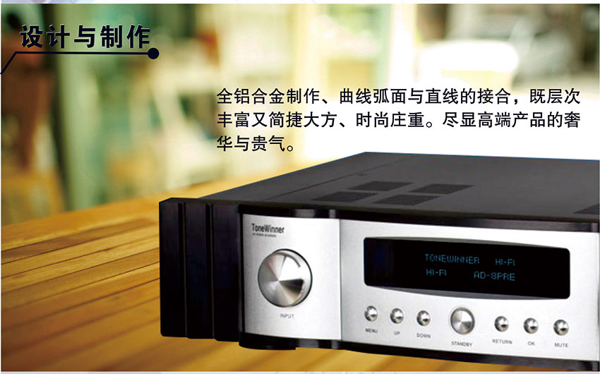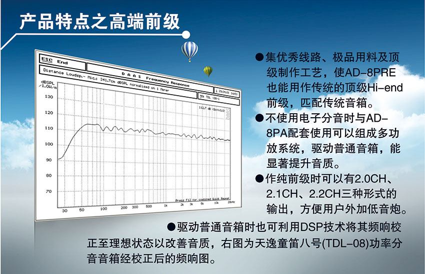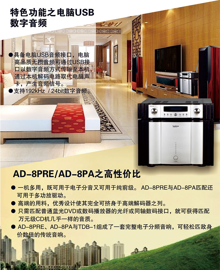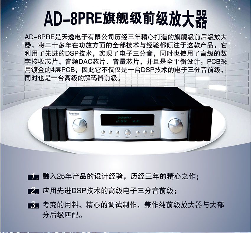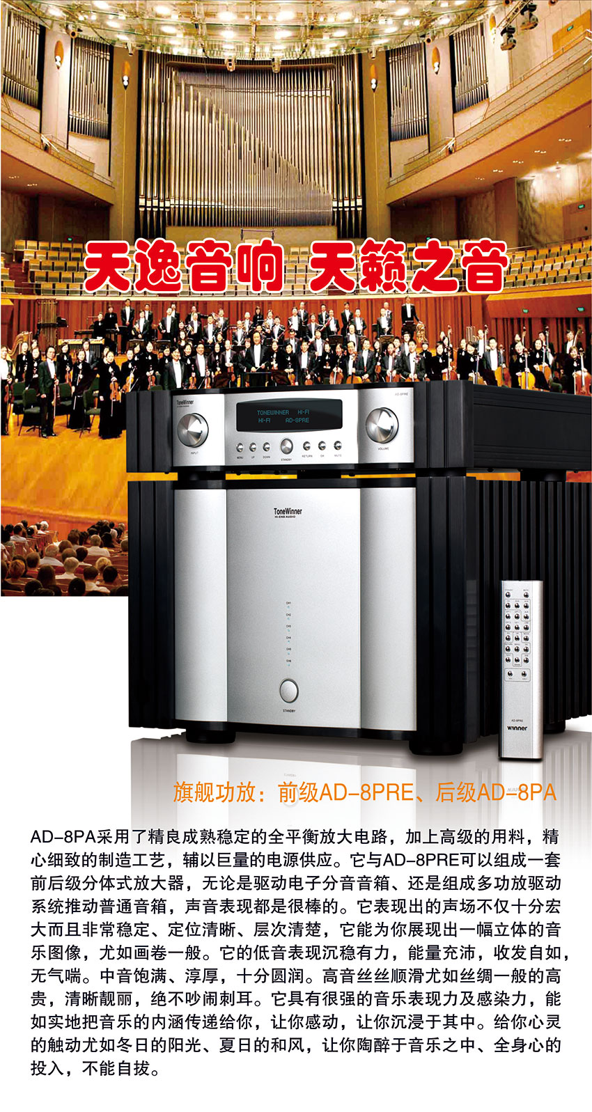 产品简述:简介:AD-8PRE/AD-8PA前后级电子分频HI-END功放,属于天逸呕心沥血开发研制的迄今为止天逸最高端旗舰级高保真功放,这是天逸音响多年来积累的高保真功放之经验和时下音响业界DSP数字声效高新技术结合的完美产物,该产品可配两分频、三分频HI-END级书架箱或落地箱玩电子分音,也可配合任何品牌的传统高保真音箱玩双功放分音,亦可配合任何高保真音箱和有源低音炮玩双功放+2.1高保真系统。玩法很多,音质音色堪称完美!值得对音质音色有极严格的要求、追求极致音质的骨灰级音响发烧友关注和购买。