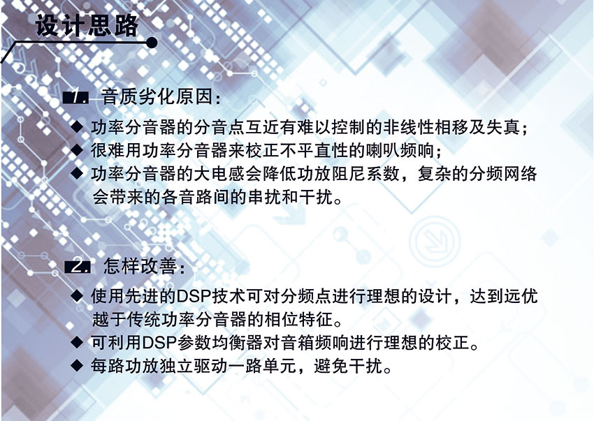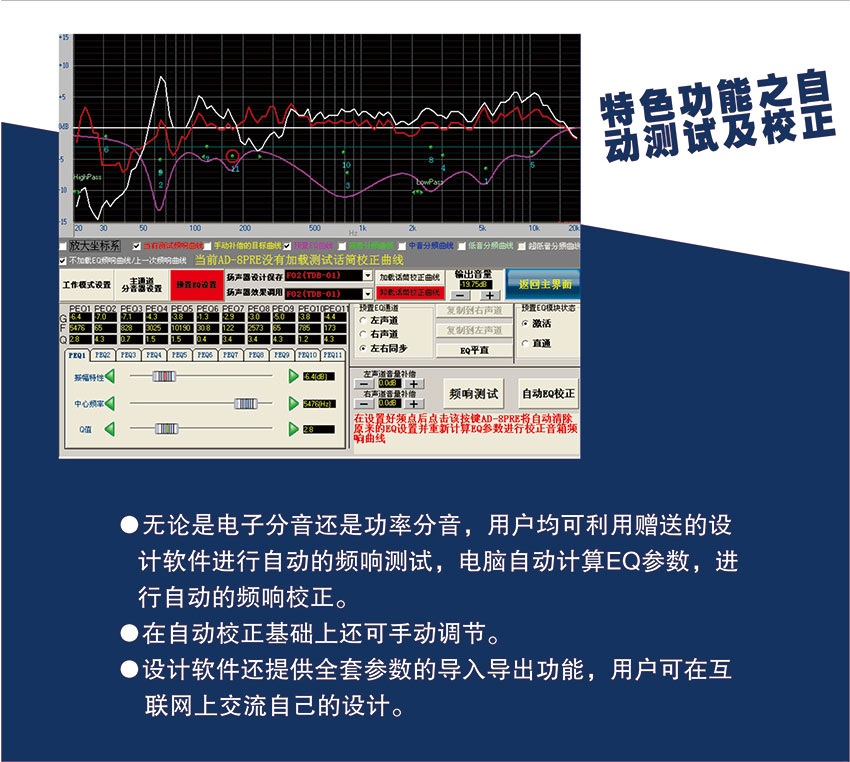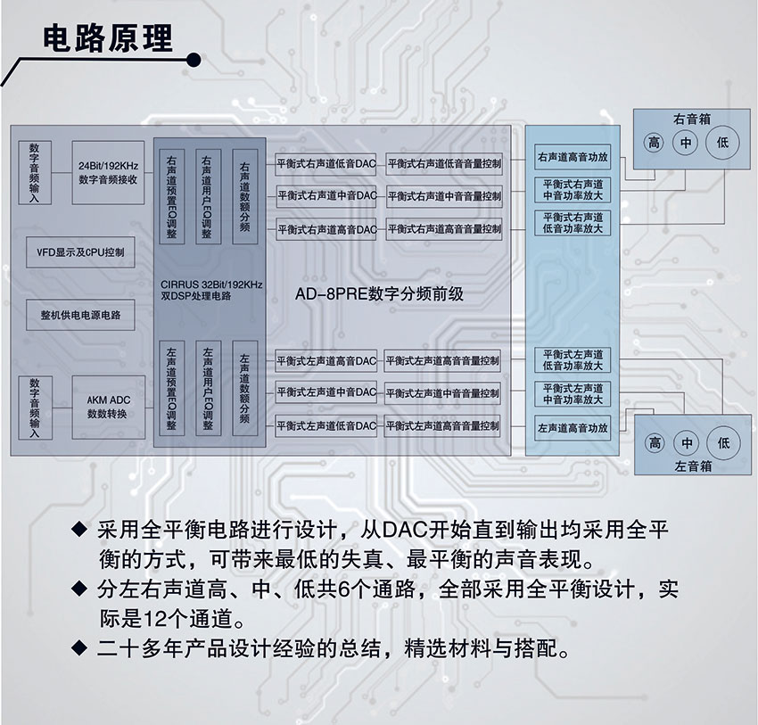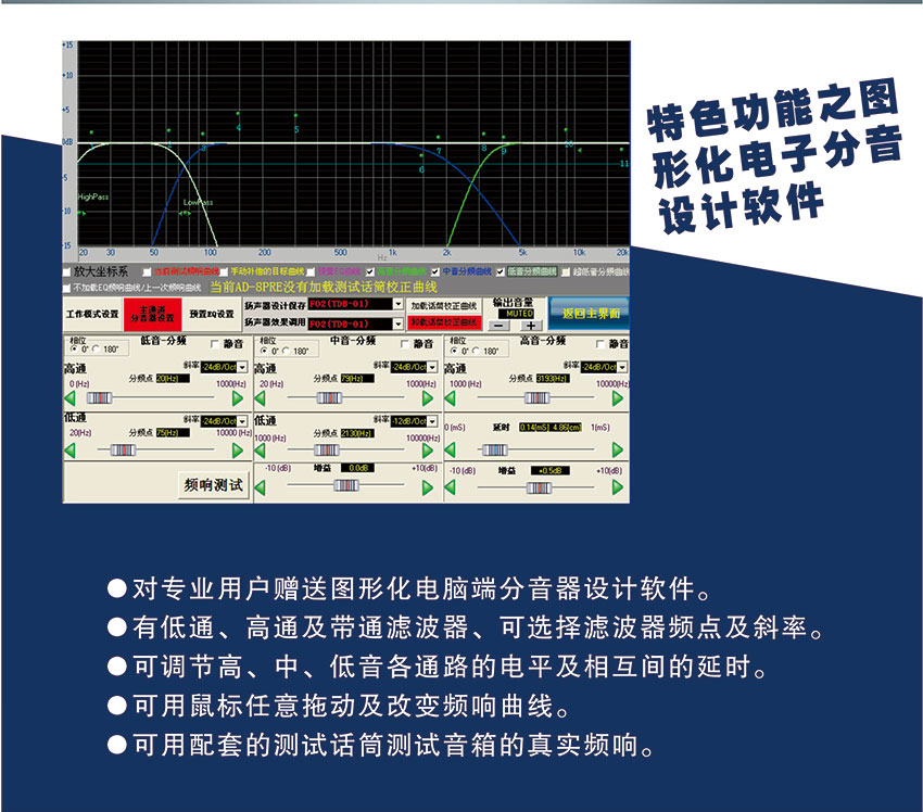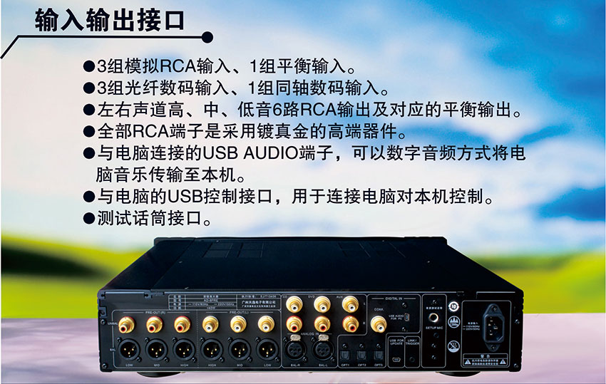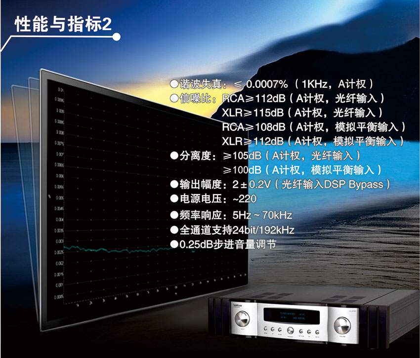 产品简述:简介:AD-8PRE/AD-8PA前后级电子分频HI-END功放,属于天逸呕心沥血开发研制的迄今为止天逸最高端旗舰级高保真功放,这是天逸音响多年来积累的高保真功放之经验和时下音响业界DSP数字声效高新技术结合的完美产物,该产品可配两分频、三分频HI-END级书架箱或落地箱玩电子分音,也可配合任何品牌的传统高保真音箱玩双功放分音,亦可配合任何高保真音箱和有源低音炮玩双功放+2.1高保真系统。玩法很多,音质音色堪称完美!值得对音质音色有极严格的要求、追求极致音质的骨灰级音响发烧友关注和购买。