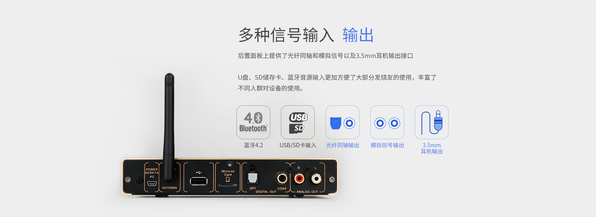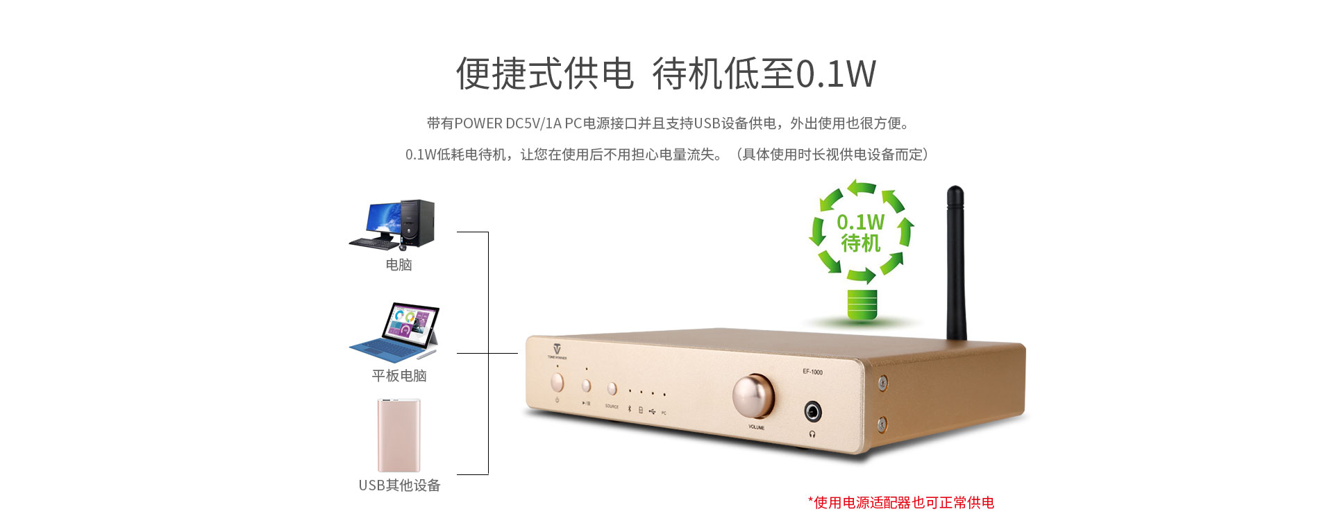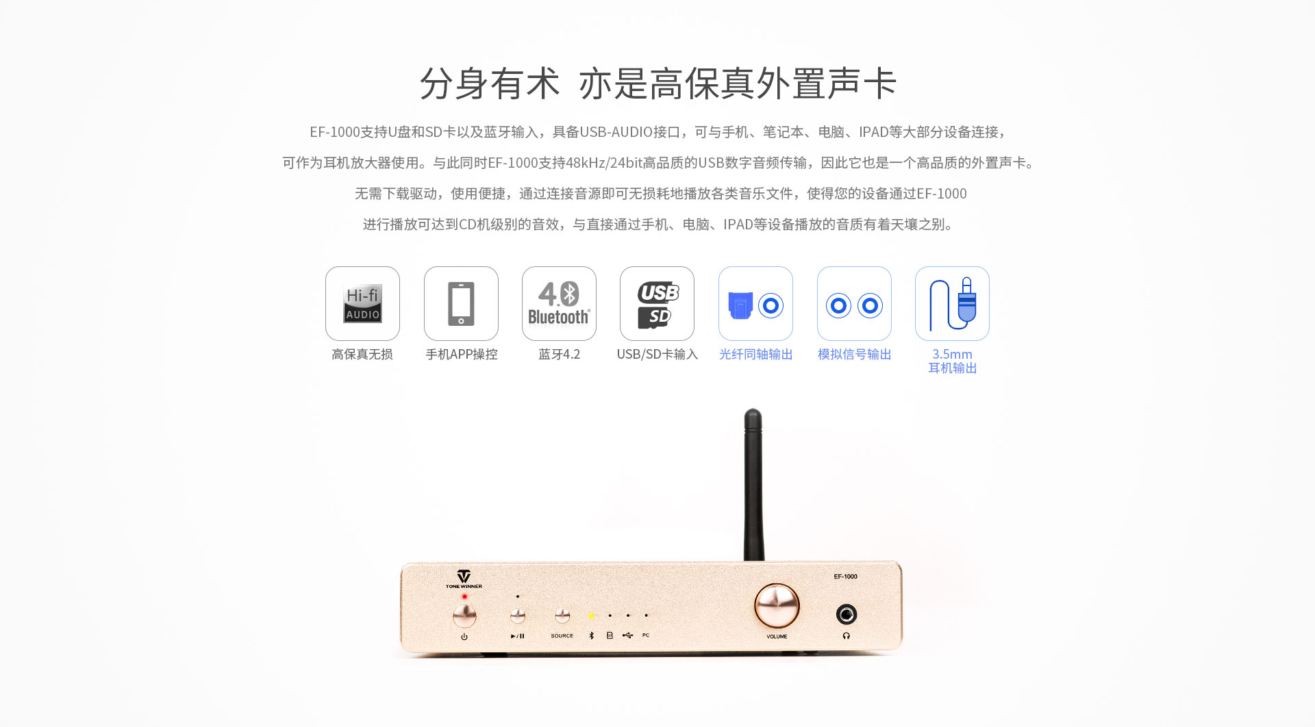 产品简述:简介:EF-1000是一款集多种数字音源接收和处理的蓝牙播放器。它支持蓝牙无线接收可作为高品质数字播放器使用;支持TF卡、U盘等高品质音乐本地播放;支持USB Audio,USB供电的同时带给你高品质音乐享受,可作为高品质外置声卡使用;支持手机APP控制,操作简单方便;内置专业高品质音频解码芯片,解析力极强,是一款高品质解码器;带有3.5通用耳机插孔,同时是一款高品质耳放。多功能集于一身,是播放器的不二之选。