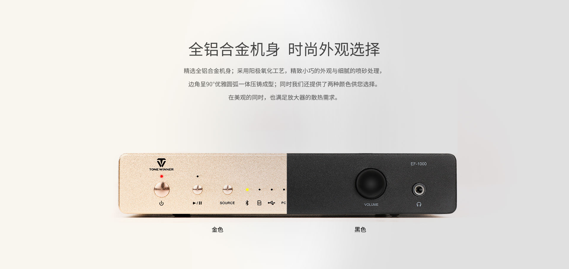 EF-1000外观精致便携,有香槟金、典雅黑两色可选。精雕细琢的全铝合金机身,不仅时尚美观且有利于整机散热;面板采用阳极氧化工艺与极其精细的喷砂处理,不褪色;优雅圆弧棱角设计一体成型,美观大气且手感极佳。