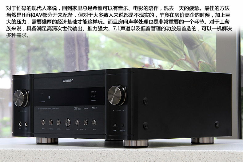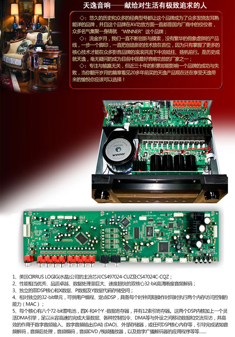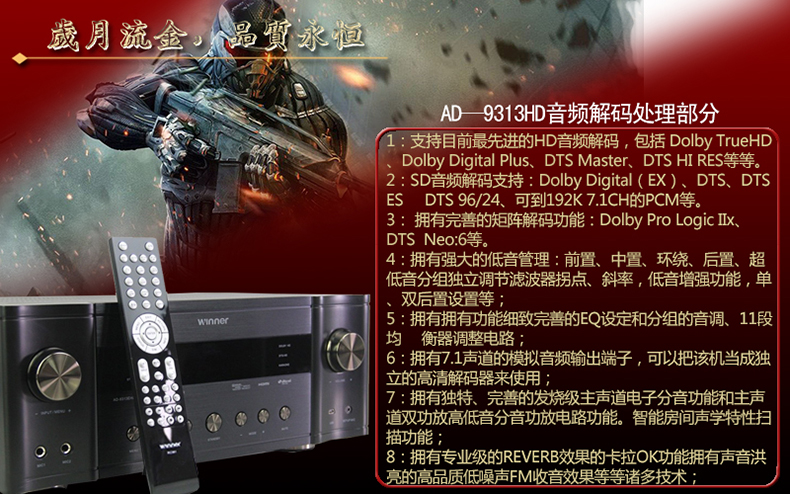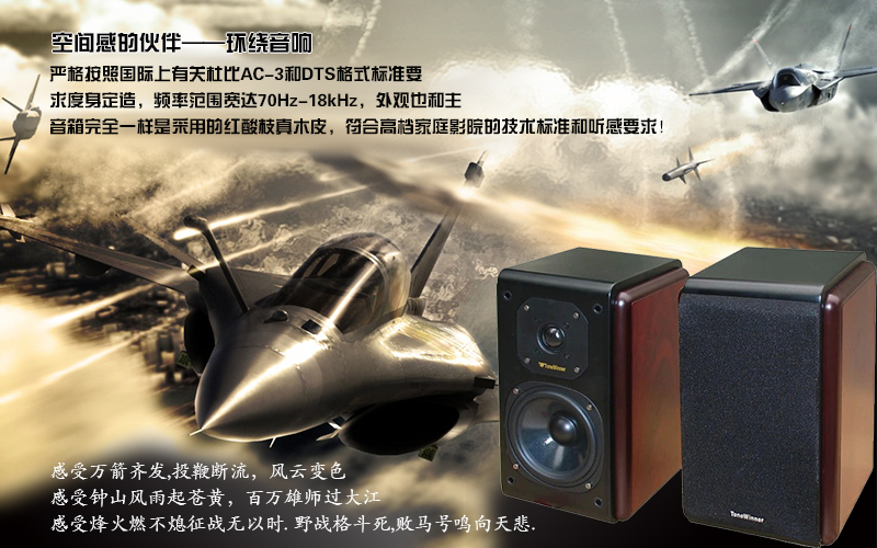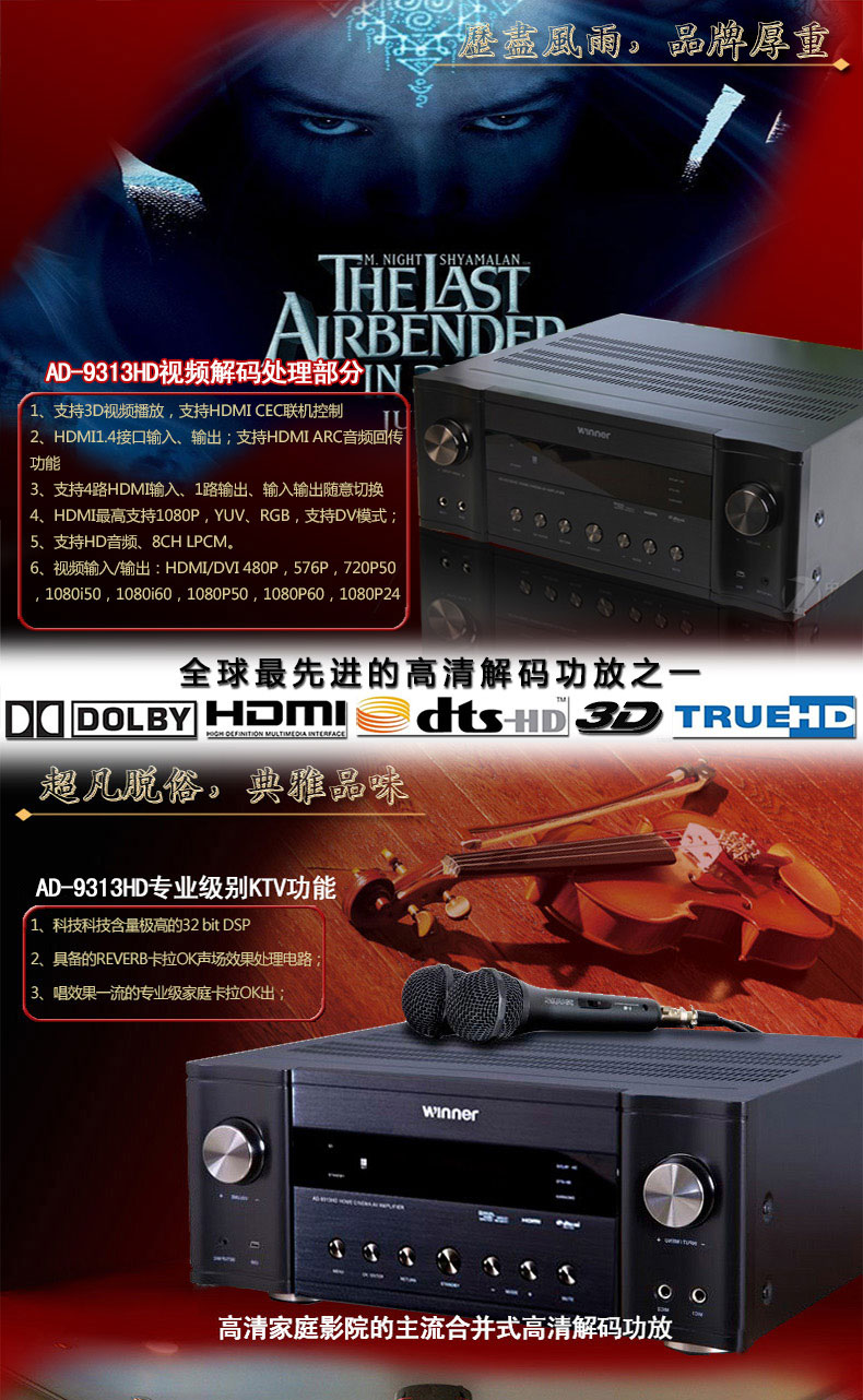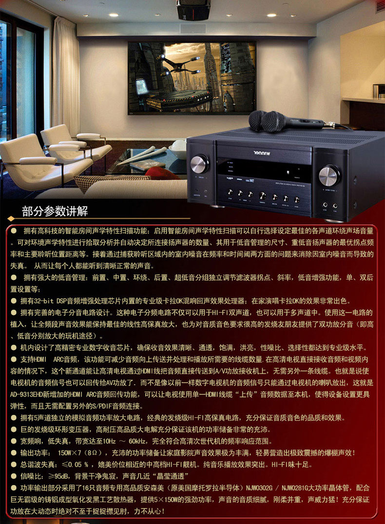 产品简述:简介:“新高清二号”套装家庭影院是由天逸最新上市的7.1声道次世代高清合并式功放AD-9313HD,搭配由高保真理念设计的AV/HI-FI兼容音箱 “童笛5号”而组成。该组合拥有目前最先进的HD音频解码和SD音频解码技术、双核处理芯片,以及HDMI1.4传输技术,功能众多,接口全面,功率储备也相当的充沛。并拥有功能强大的房间声频扫描、EQ调校及电子分频技术等。可轻易营造相当出色的环绕声场和震撼之极的声音效果。音质音色和音效都相当令人满意,并提供声效一流的卡拉OK。