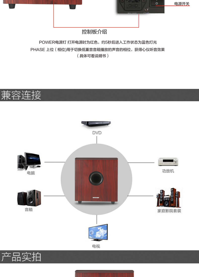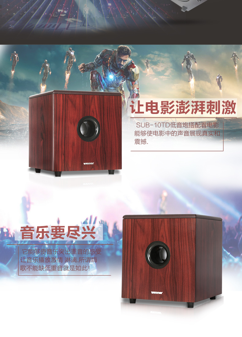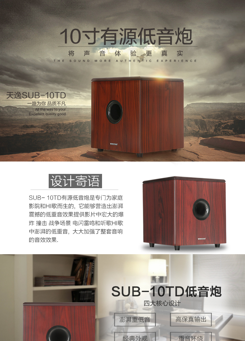 产品简述:简介: SUB-10TD有源低音炮就是专门为高清次世代家庭影院套装系列音响度身订做的10寸有源低音炮,具有输出功率强劲,功率储备充沛,可以用在家庭影院系统中营造出超强震撼的低音效果,提供影片中场面宏大的爆炸、撞击、战争场景、电闪雷鸣、火山喷发、自然灾害等极致震撼的恢弘气势,极大的加强了整套音响的音频效果。