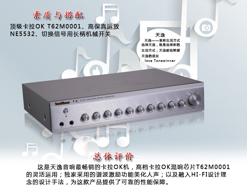 产品简述:简介:这是天逸音响最畅销的卡拉OK机,也是天逸卡拉OK产品的常青树,高档卡拉OK混响芯片T62M0001的灵活运用;独家采用的谐波激励功能美化人声;以及融入HI-FI设计理念的设计手法,为这款产品提供了可靠的性能保障,演唱效果为大家所认可。