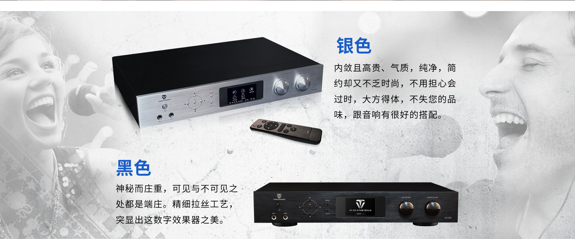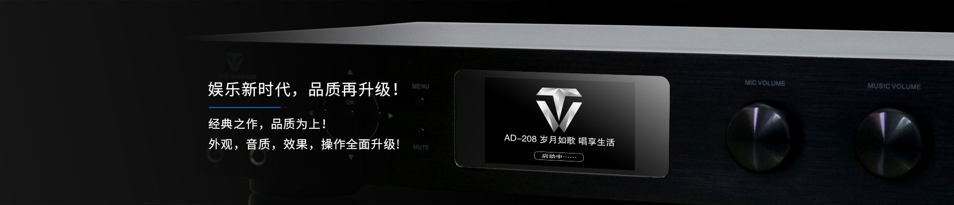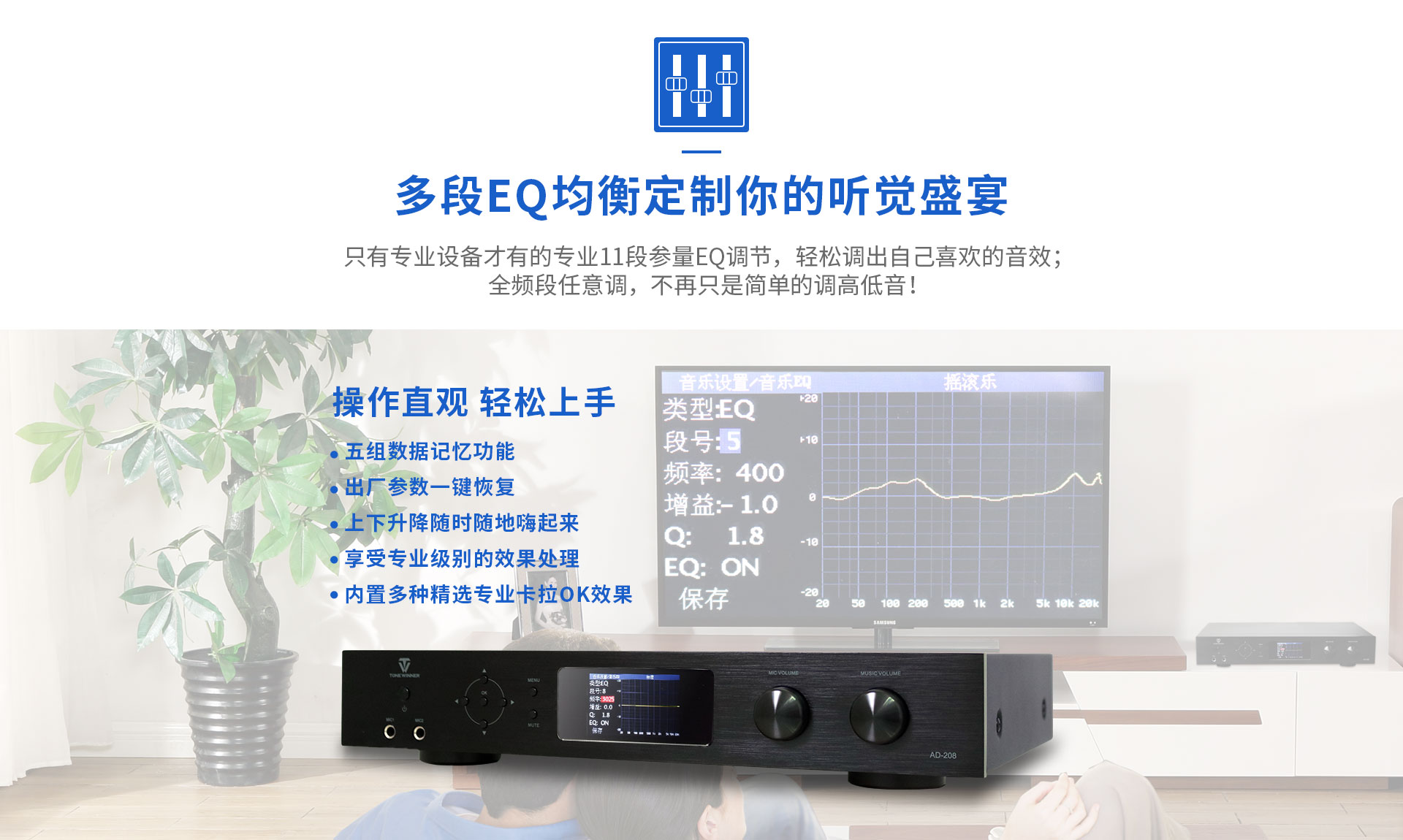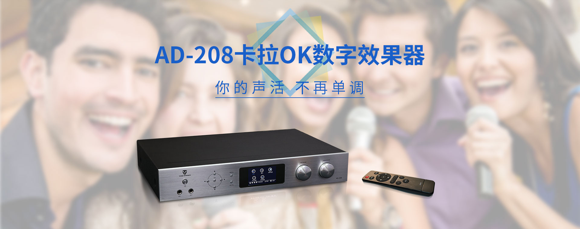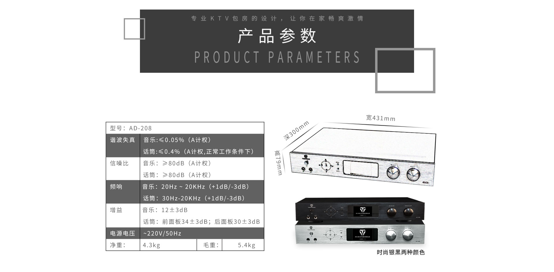 产品简述:简介:AD-208是一款高性能的数字立体声混响和多用途的卡拉OK效果器,独家采用的谐波激励功能美化人声,让任何人都可K出一口好歌。全中文彩屏显示,操作更加直观方便,功能协调体贴入微。话筒参数包括效果音量、延时时间、EQ及高低通滤波调节等,是一款应市场需求而特别设计的、可应用于多种形式演唱环境的高品质效果器。