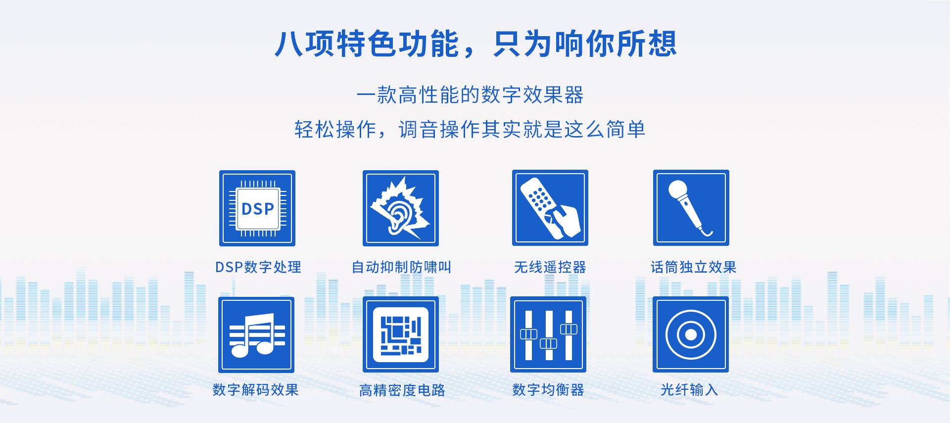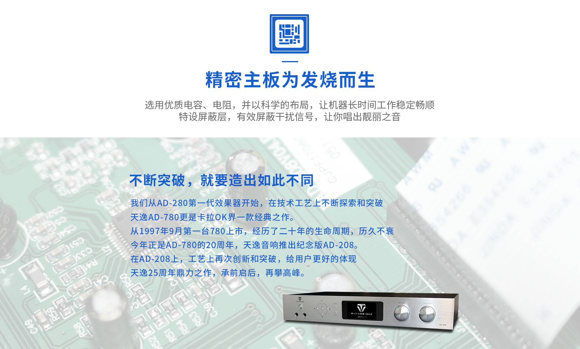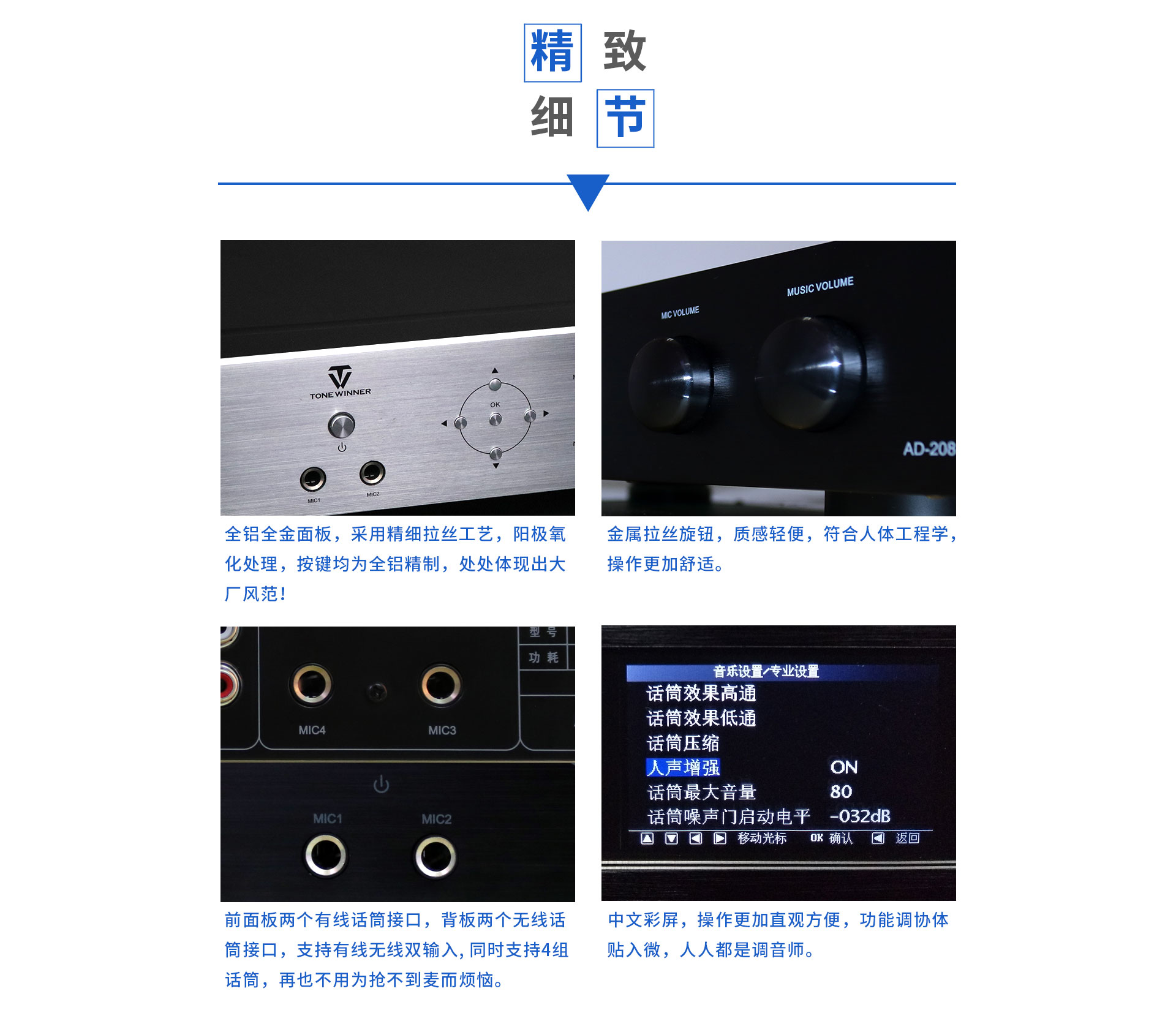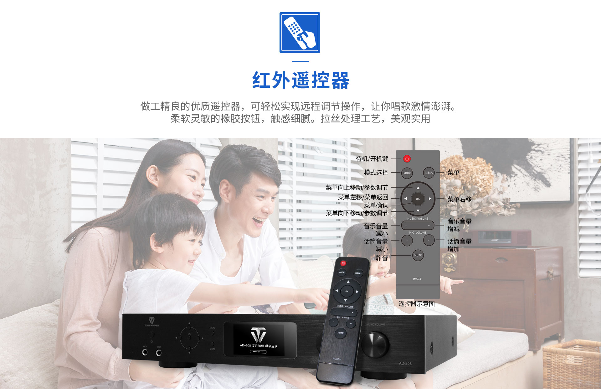 产品简述:简介:AD-208是一款高性能的数字立体声混响和多用途的卡拉OK效果器,独家采用的谐波激励功能美化人声,让任何人都可K出一口好歌。全中文彩屏显示,操作更加直观方便,功能协调体贴入微。话筒参数包括效果音量、延时时间、EQ及高低通滤波调节等,是一款应市场需求而特别设计的、可应用于多种形式演唱环境的高品质效果器。