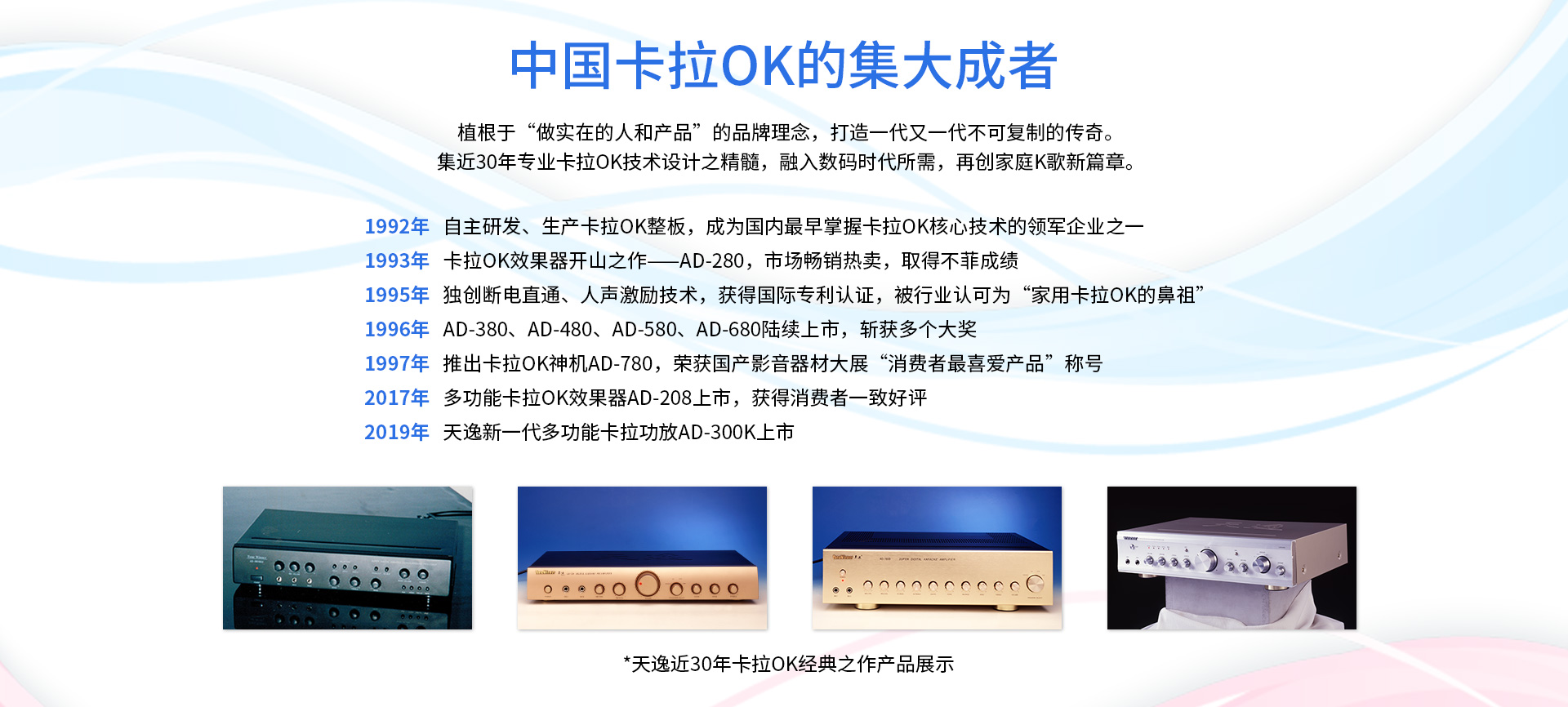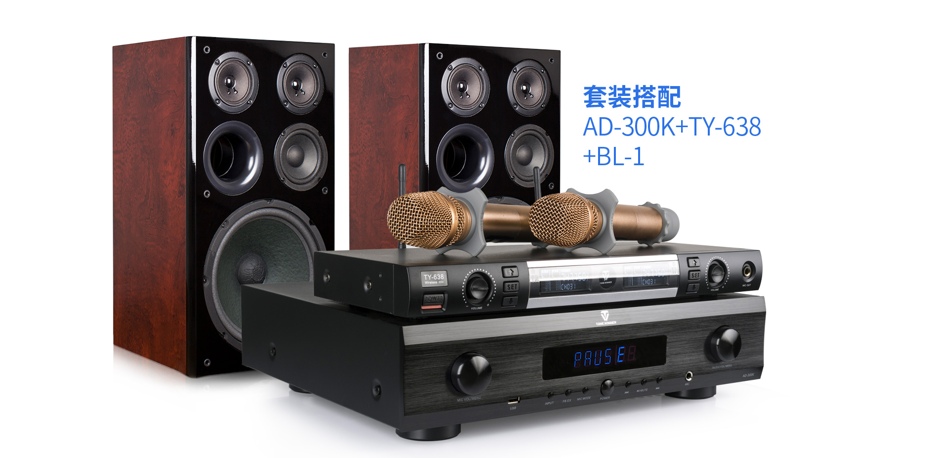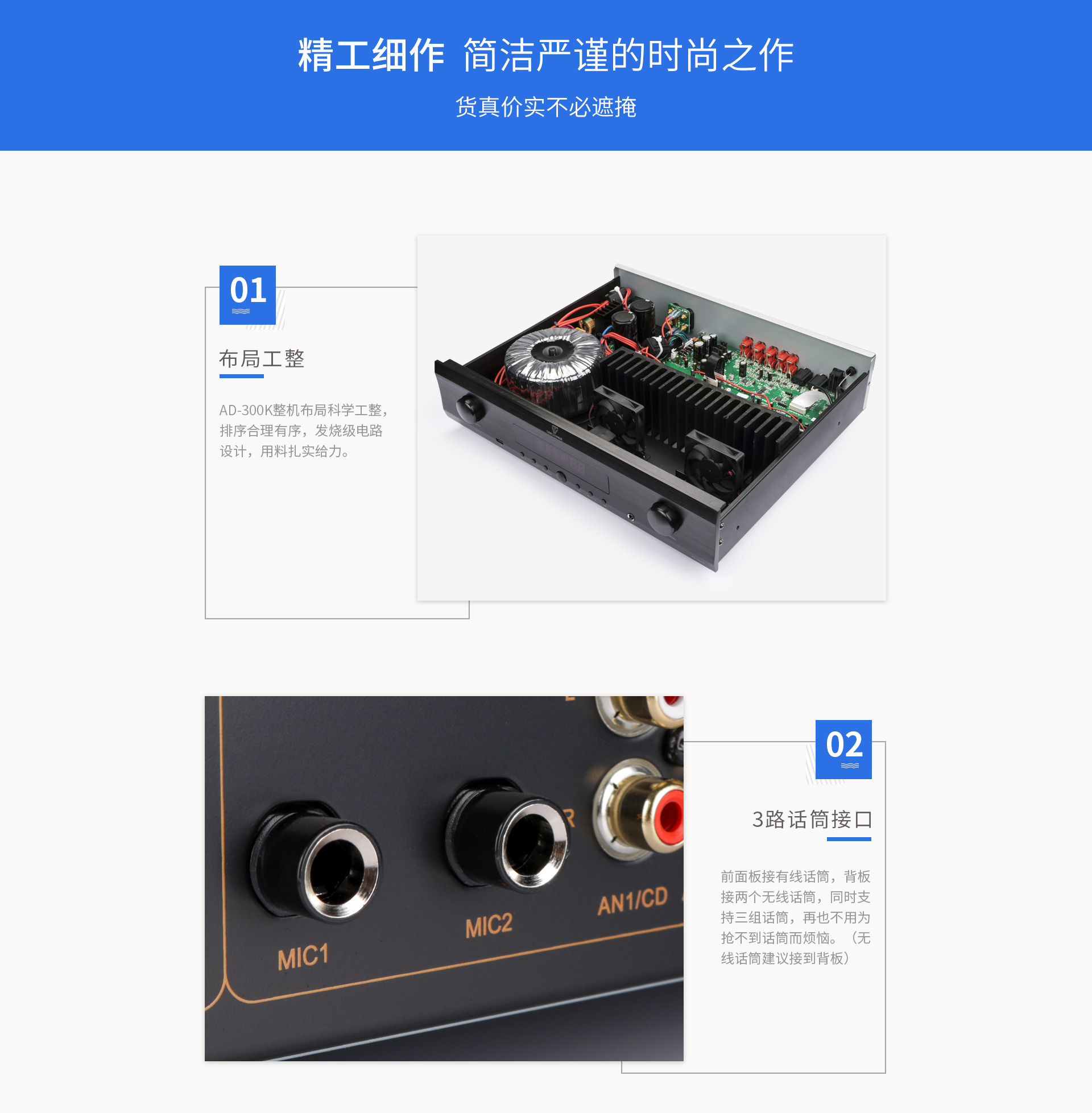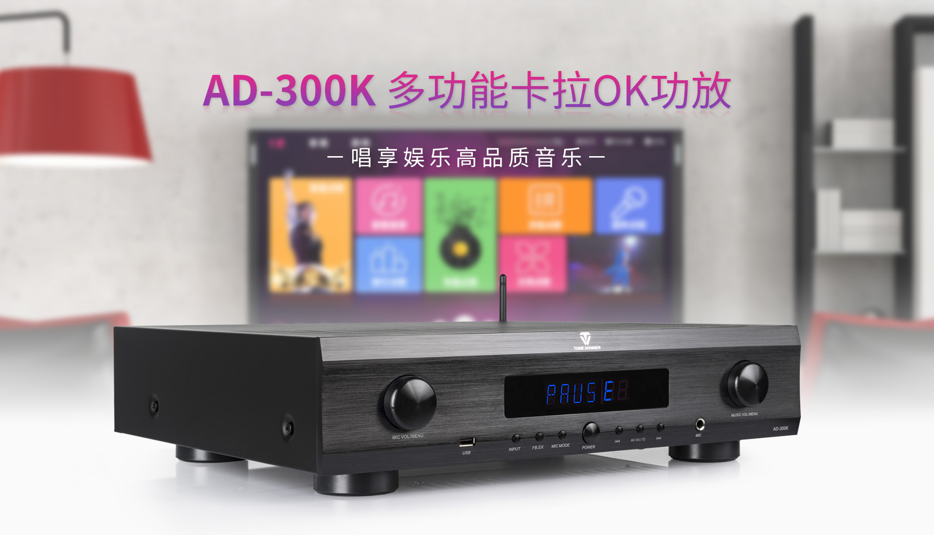 AD-300K功放概述 一、产品简介: 本机是一款高性能的数字立体声混响和多用途的卡拉OK功放,话筒参数包括效果音量、延时时间、EQ调节等,是一款应市场需求而特别设计的,可应用于多种形式的演唱环境。