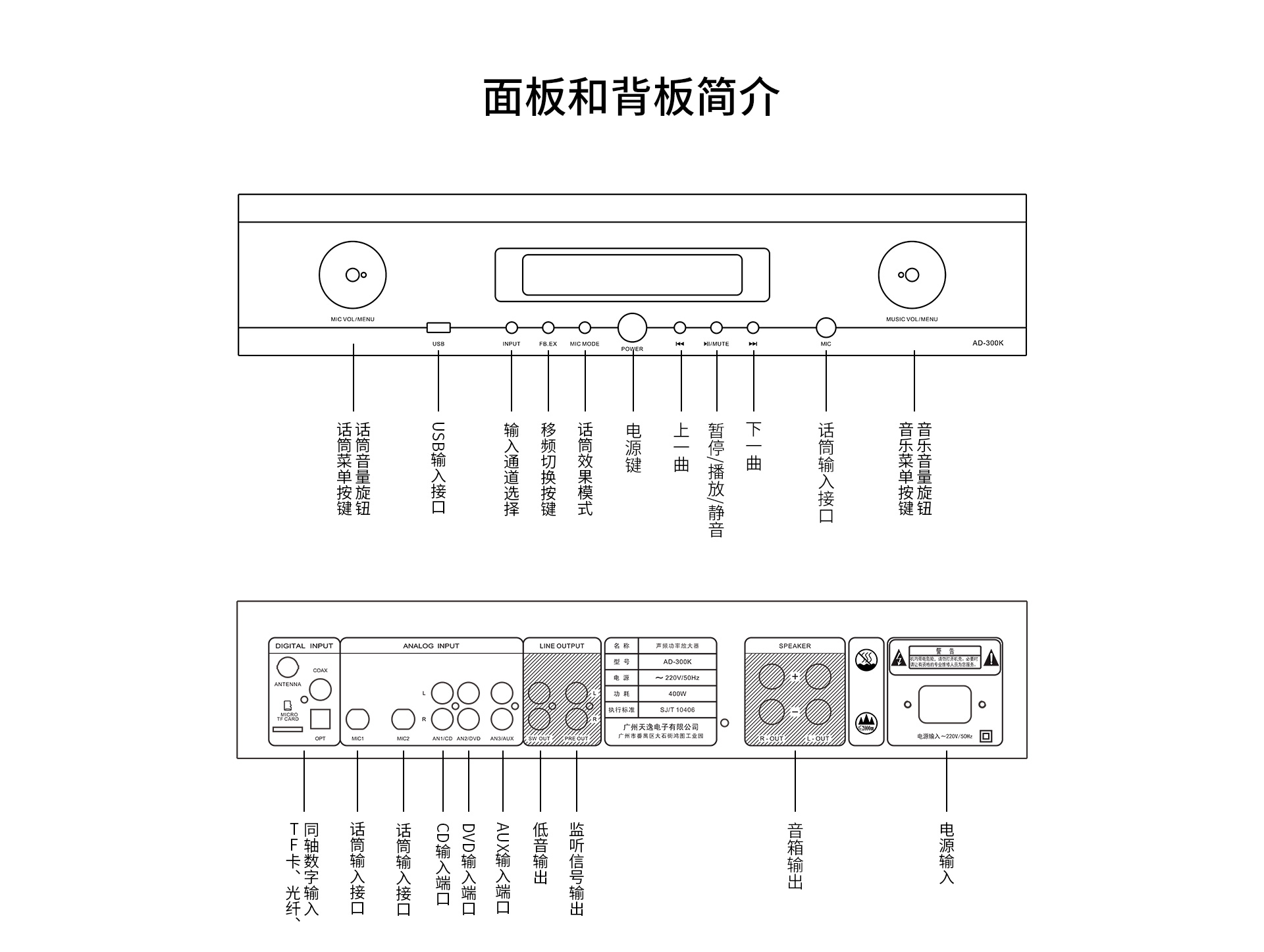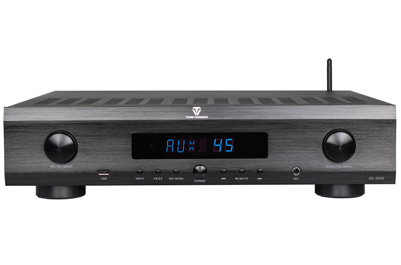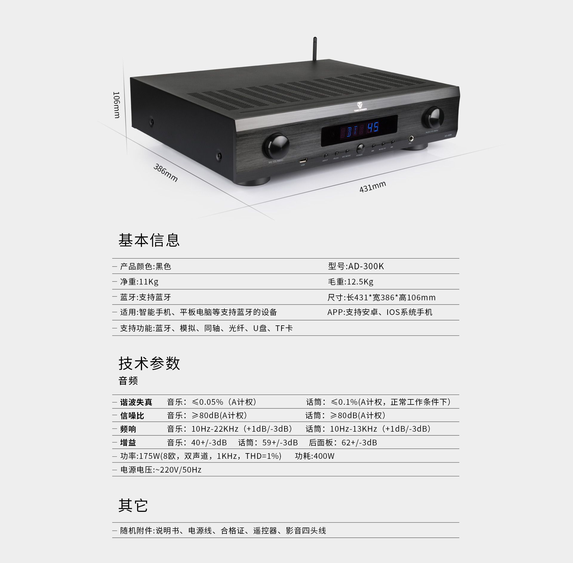 二、功能介绍: 1.大功率专业DSP数字卡拉OK功放; 2.支持U盘、TF卡播放; 3.蓝牙、光纤、同轴、模拟等多种型号输入; 4.支持手机APP控制; 5.全功能红外遥控器控制; 6.机内智能温控系统; 7.具备立体声型号与超低音信号输出;