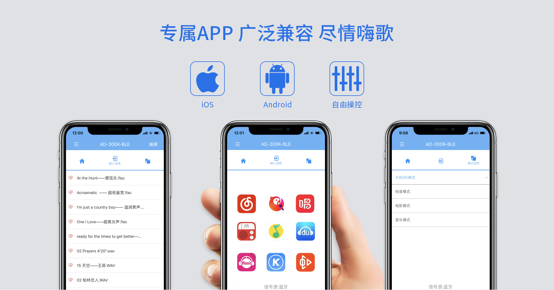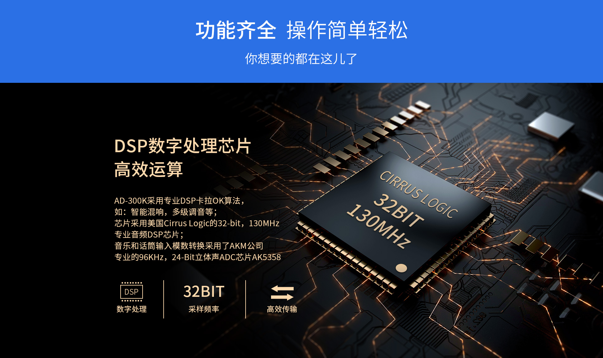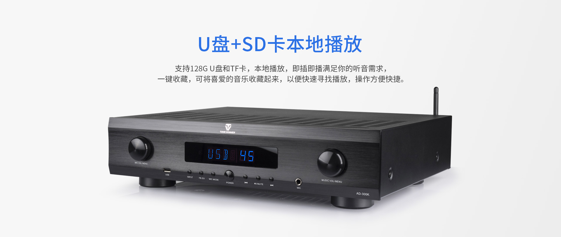 二、功能介绍: 1.大功率专业DSP数字卡拉OK功放; 2.支持U盘、TF卡播放; 3.蓝牙、光纤、同轴、模拟等多种型号输入; 4.支持手机APP控制; 5.全功能红外遥控器控制; 6.机内智能温控系统; 7.具备立体声型号与超低音信号输出;