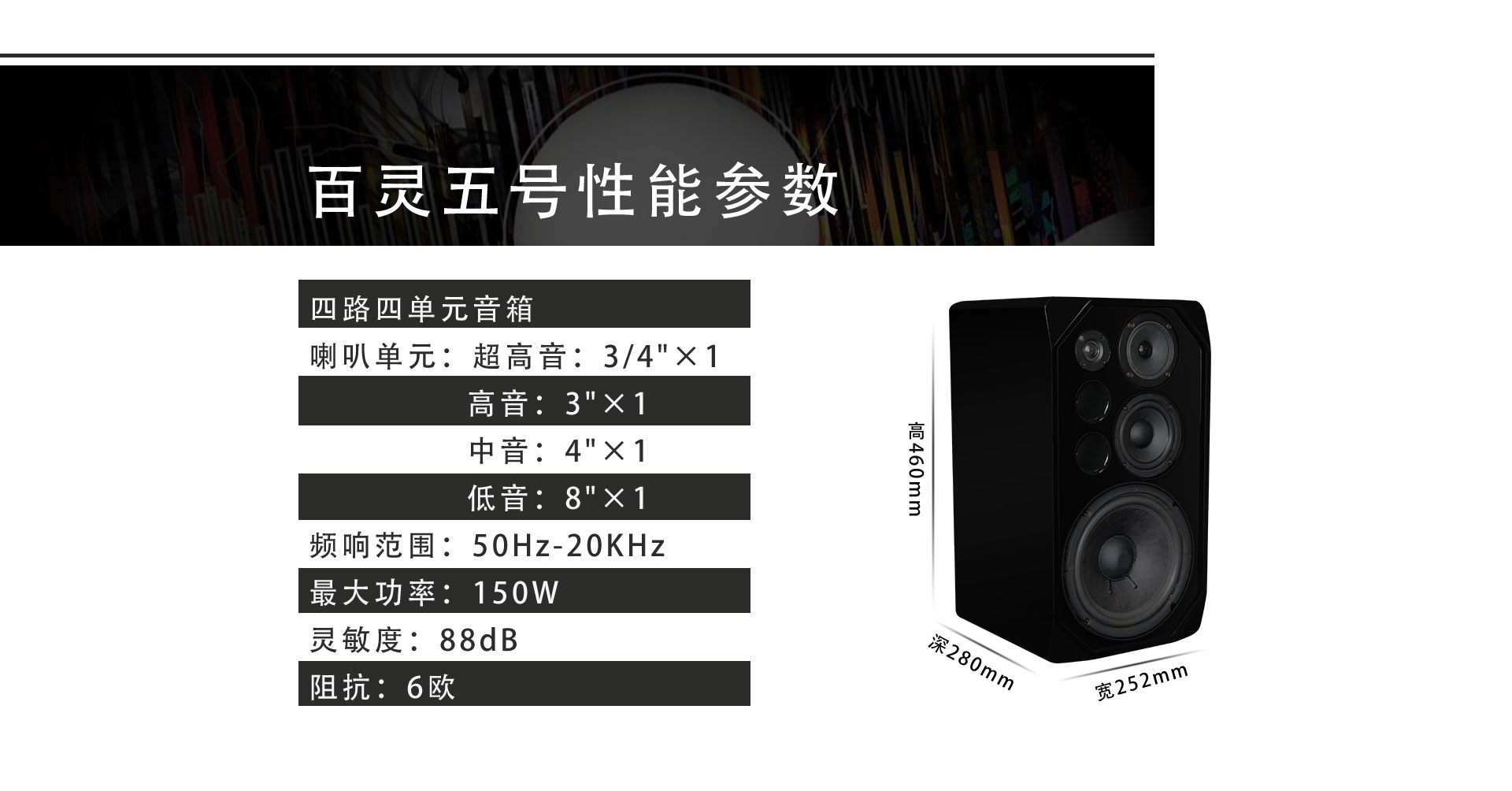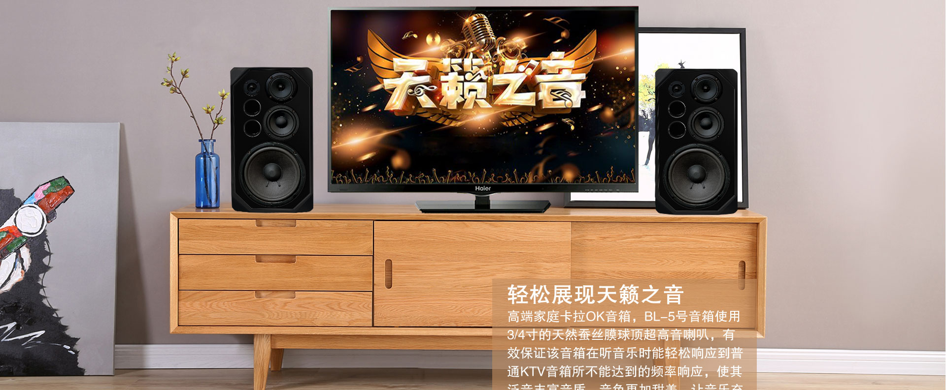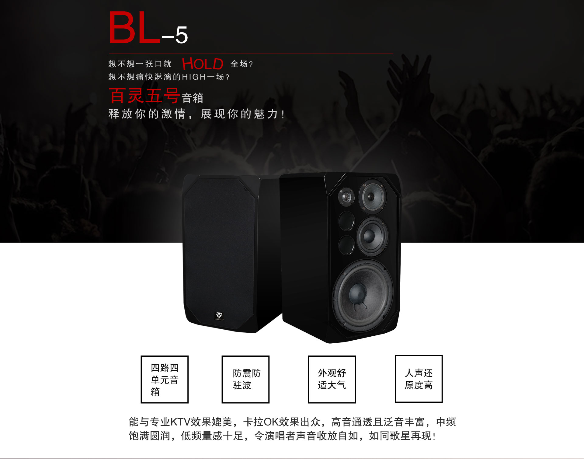 产品简述:简介:BL-5 百灵五号是天逸专注于品质音质一同兼具的高端家庭卡拉OK音箱,选用了具有8寸大音圈的超长冲程低音喇叭、一只4寸的中音喇叭、一只3寸的高音喇叭以及一只3/4寸的超高音喇叭,组成了功率承受能力相当强、灵敏度很高、现场感和震撼力非常好的三分频四单元书架音箱。该箱采用黑色亮光烤漆工艺,经典黑色能与任意的装修风格融为一体,是家庭KTV的必备神器!