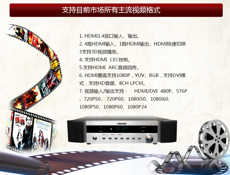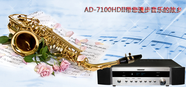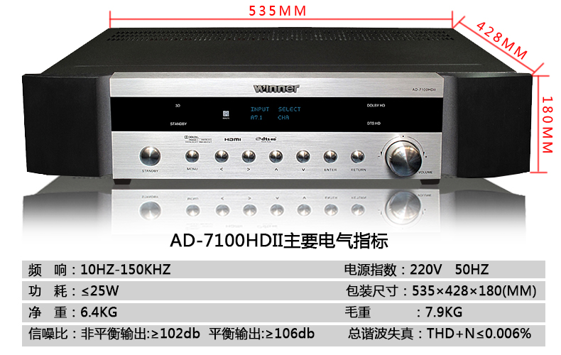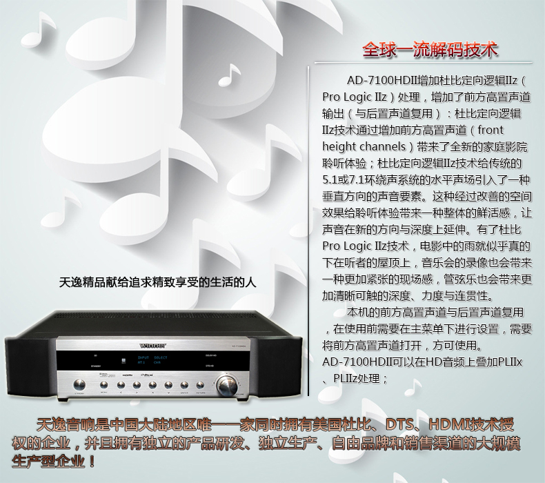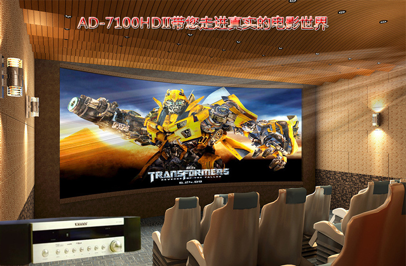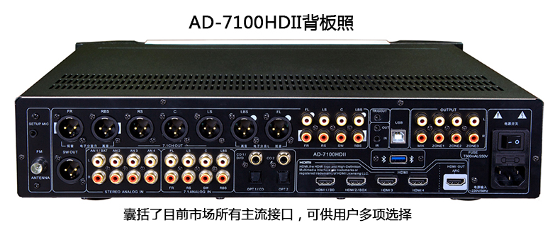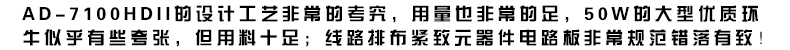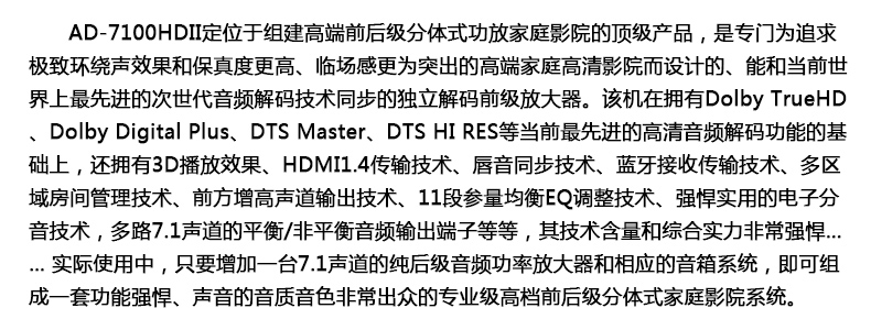 AD-7100HDⅡ整体外观高档大气,面板采用铝合金材料,拉丝设计,黑加银的色调低调又有内涵。 二、电路及用料设计 AD-9300HD为参照对比,介绍一下这台前级解码器和AD-9300HD不同的技术要点: AD-7100HDII选用了两片来至美国CIRRUS LOGIG(水晶)公司的双核DSP芯片 CS497024-CUZ和CS495314-CUZ (而AD-9300HD使用的是CS497024-CUZ和CS47048-CQZ)来担任高清音频解码和解码后音频效果处理等功能。其中在AD-7100HDII中担任解码后音频效果处理的CS495314-CUZ芯片 ,其运算能力明显强于AD-9300HD解码后音频效果处理芯片,加之AD-7100HDII在CS495314-CUZ的解码后处理编程应用中,去除了卡拉OK数字混响延时等在音频后处理芯片中所的占用空间,使其专一的进行声场及音响效果的处理。 三、主要功能表述 1. 支持目前最先进的HD音频解码,包括 Dolby TrueHD、Dolby Digital Plus、DTS Master、DTS HI RES等等。 3. 拥有完善的矩阵解码功能:Dolby Pro Logic IIx、DTS Neo:6等。4. 智能房间声学特性扫描。 6. 分组的音调、11段参量均衡器EQ调整。 8. 高品质FM收音,采用专业数字收音芯片。 10. 具备蓝牙接收传输技术 12. S/P DIF数字信号输出2CH PCM. 1. HDMI1.4接口输入、输出。 3. HDMI最高支持1080P,YUV、RGB,支持DVI模式,支持HD音频、8CH LPCM。 5. 支持HDMI CEC控制。6.支持HDMI ARC音频回传。
