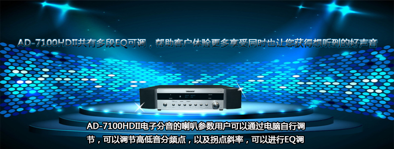 AD-7100HDII与AD-9300HD的区别如下: 增加杜比定向逻辑(与后置声道复用):杜比定向逻辑本机的前方高置声道与后置声道复用,在使用前需要在主菜单下进行设置,需要将前方高置声道打开,方可使用。2、,而3、AD-7100HDII的EQ为EQAD-9300HD为图示EQ。一般的均衡器往往是在若干个固定频率点上对信号进行提升或衰减。为了较为精确地调整频率特性,往往要采用多频点的均衡器。 参量均衡器不是采用固定频率点的均衡器,而是将整个音频频率范围分为几个频率段进行均衡处理,本机为11段的参数均衡器;每一频率段的中心频率可以调整,提升或衰减量可以调整,还可调整其带宽(即调整Q值)。这样,一个参量均衡器就能够覆盖整个音频频率范围,并能够进行较为精确的频响特性调整;不同于图形均衡器的只能对相对固定的频段进行提升和降低,参量均衡器可以对全频段上的任何一个频率进行操作。 AD-7100HDII的参量均衡器为5声道;相比AD-9300HD具有更强的处理能力,支持音频信号采样频率更高, 有音频输出AD-7100HDII的HDMI OUT输出接口含有音频信号,除了模拟7.1CH输入以外,其它输入时都有音频输出,AD-9300HD的HDMI没有音频输出 4个区域管理AD-9300HD只有一个主房间AD-7100HDII除了了主房间以外,另外增加了3个副房间,ZONE2,ZONE3,ZONE4,分别具有一组独立的立体声L/R接口输出,可以对这些房间进行独立的输入音源选择,独立音量控制,可以选择音源与主房间一致,也可以选择其它输入源;这样可以达到一台处理机同时对几个房间分别进行控制的效果。 有外置蓝牙模块接口AD-7100HDII具有外置蓝牙接口,可以与我司配套的蓝牙模块进行配套使用,蓝牙模块为蓝牙V2.1+EDR版本,蓝牙输出SPDIF数字信号,再经本机解码,声音品质高,蓝牙模块可以与市售的具有蓝牙功能的设备进行连接,达到无线音乐传输的目的,使用简单、方便。 7.1CH平衡和非平衡输出,没有功放模块AD-9300HD有7声道功放模块,SW非平衡线路输出。AD-7100HDII不仅仅具有7.1CH非平衡输出,同时还自带7.1CH的平衡输出接口,平衡是差分信号,对抑制共模干扰非常有效,有助于防止电缆中的噪音干扰,这样相比非平衡传输来说声音品质可以达到更好。 触发输出使用更加灵活,可用于指定的输入和房间,也可设置为常开或常关AD-9300HD的触发输出只能设置为常开或常关。 没有卡拉。 电子分音的喇叭参数用户可以通过电脑自行调节EQ调节等等,以下为电脑上位机软件的调试界面。 每个输入源可单独设置电平偏移量12、AD-7100HDII使用,厂家建议选配天逸纯后级 声 道 7 非平衡输入:频响范围:总谐波失真:额定阻抗:整机功耗:分 离 ≥76dB 12dB 外观颜色:黑银色 重:整机尺寸:长包装尺寸:长毛 7.9kg 遥控器适用场合:客厅、定制安装、体验室、会所、多媒体会议室、影 |