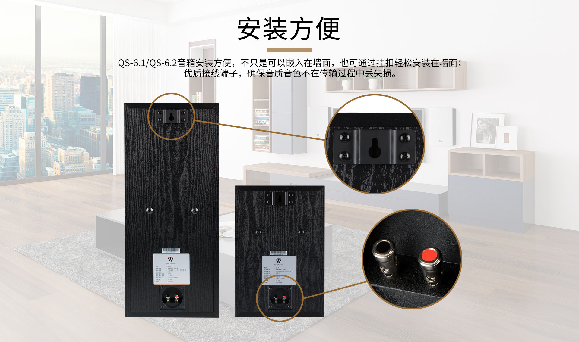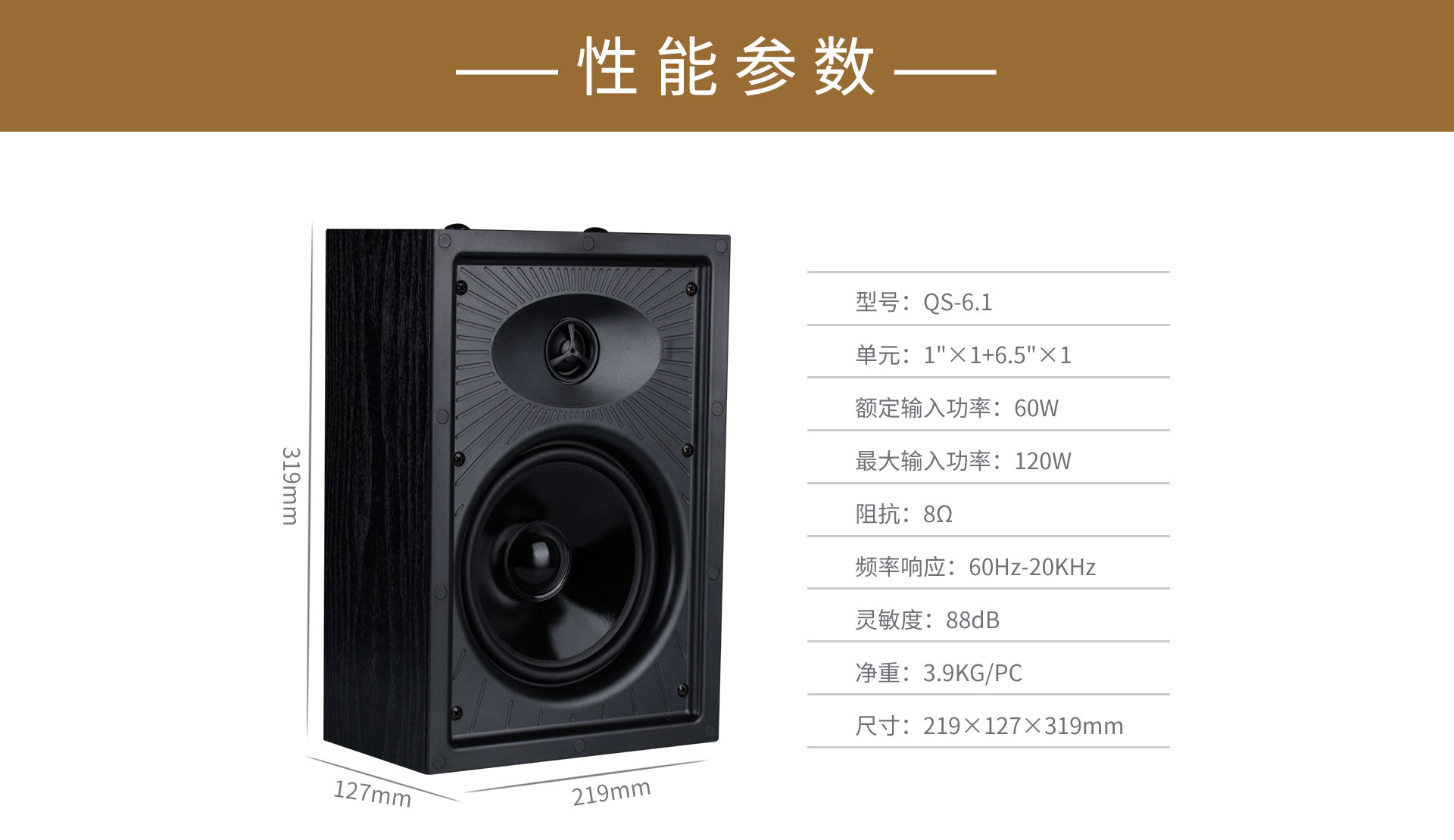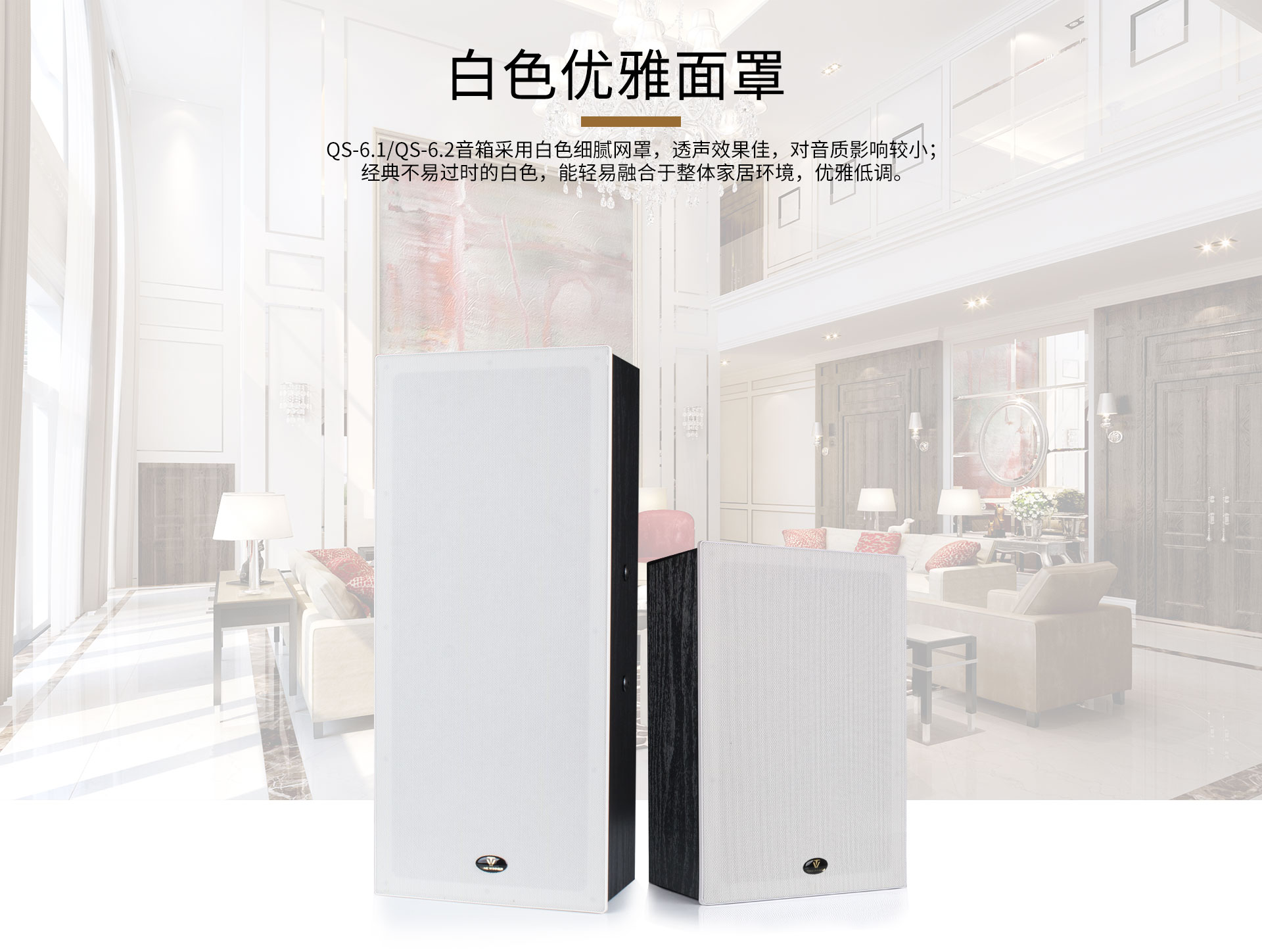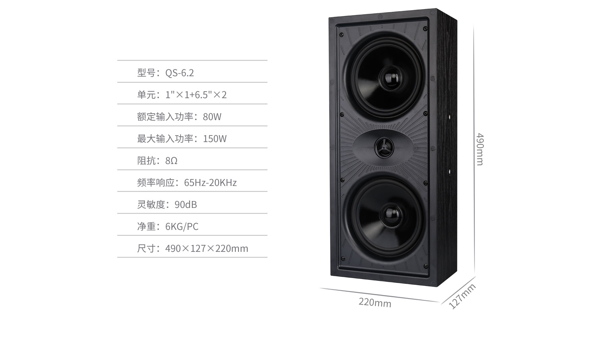 外观特点 二、整体特点 QS系列音箱性能稳定,音质极佳,低频弹性十足,瞬态良好,声音的质感明晰、音色温润醇厚,高频延伸自然,细腻。 1英寸优质高音喇叭单元,声音通透明亮;中低音部分采用6.5英寸订制喇叭单元,中音清晰,有层次,低音沉稳有力,下潜深; 三、产品型号:单元配置:<span "="" style="font-size: 16px">1"(高音)×1+6.5 "(低音)×1 dB 0Hz-20KHz 额定输入功率:60最大输入功率:120品质控制范围:±2dB(<1KHz) 箱体饰面:白色面罩 312×212mm 箱体尺寸:219(宽)最大包装外尺寸:338宽)× 单元配置:<span "="" style="font-size: 16px">1 "(高音)×1+6.5 "(低音)×2 90dB 5Hz-20KHz 阻抗:8Ω 最大输入功率:150箱体饰面:白色面罩 安装开孔尺寸:483净重:6KG/PC 毛重:7.6KG/SET ×490(高)×127(深)mm±2mm (宽)<span "=""> |