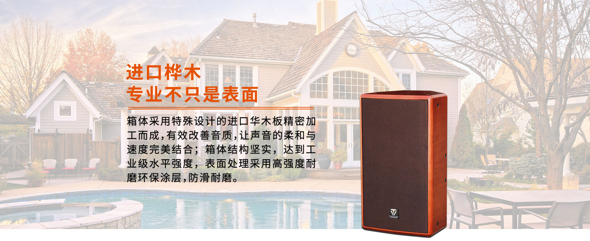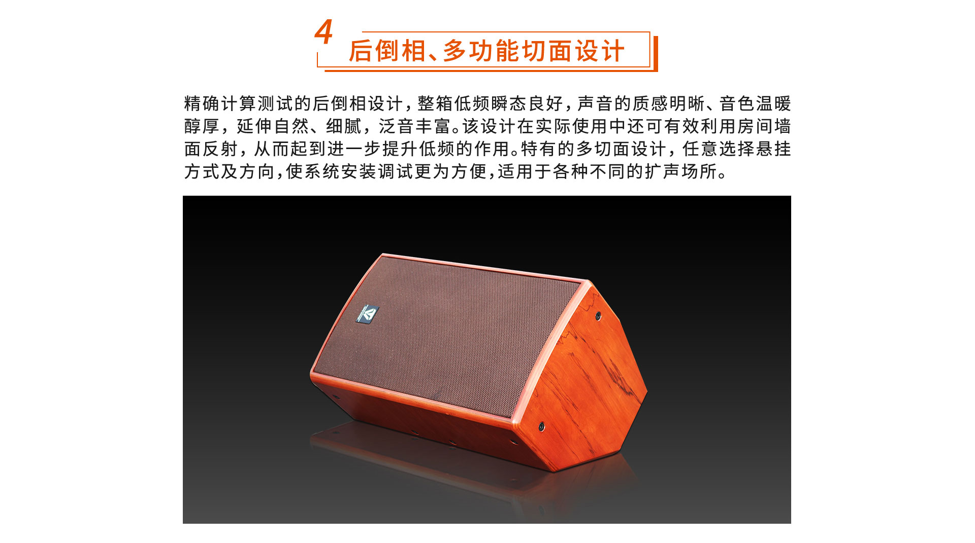 DK-100两分频专业全频音箱概述 一、外观特点 箱体采用特殊设计的进口桦木板精密加工而成,有效改善音质,让声音的柔和与速度完美结合。