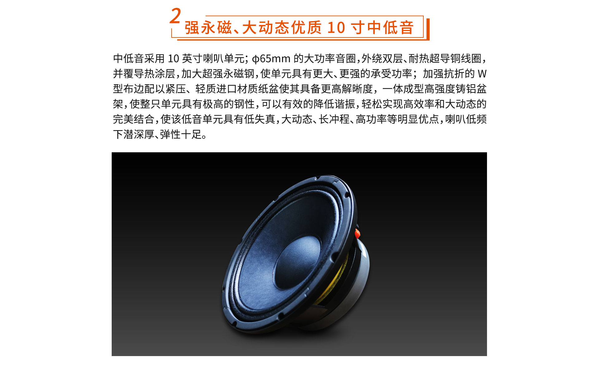 二、主要功能表述 两分频两单元多功能专业全频音箱; 1.35英寸超轻薄钛合金音膜驱动器; 10英寸大动态专业低音单元; 采用巴特沃滋滤波器及2分频电路设计,精选高品质MKP电容及无氧铜线圈电感; 精确的后倒相设计,整箱低频瞬态良好,声音的质感明晰、音色温暖醇厚,高频延伸自然、细腻、泛音丰富。