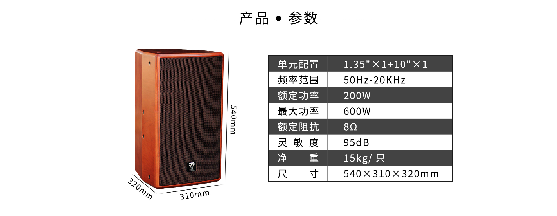 三、产品主要性能指标 单元配置:1.35"×1+10"×1 频率范围:50Hz-20KHz 灵敏度:95dB 额定阻抗:8Ω 额定功率:200W 最大功率:600W 净重:15Kg/只 箱体尺寸:540×310×320mm