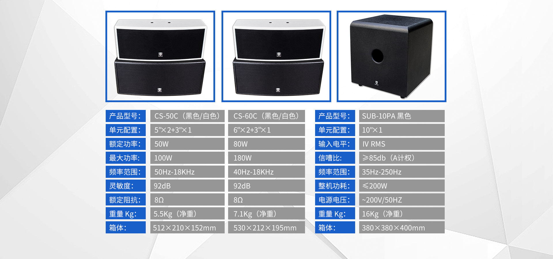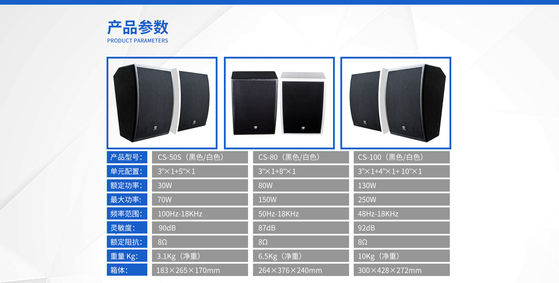 音箱型号:CS-80(黑色/白色) 单元配置:高音3″×1;低音8″×1 灵 敏 度:87dB 额定阻抗:8Ω 额定功率:80W 最大功率:150W 频率范围:50Hz-18KHz 净 重:6.5Kg/pc(净重) 箱体尺寸:264mm×376 mm×240mm