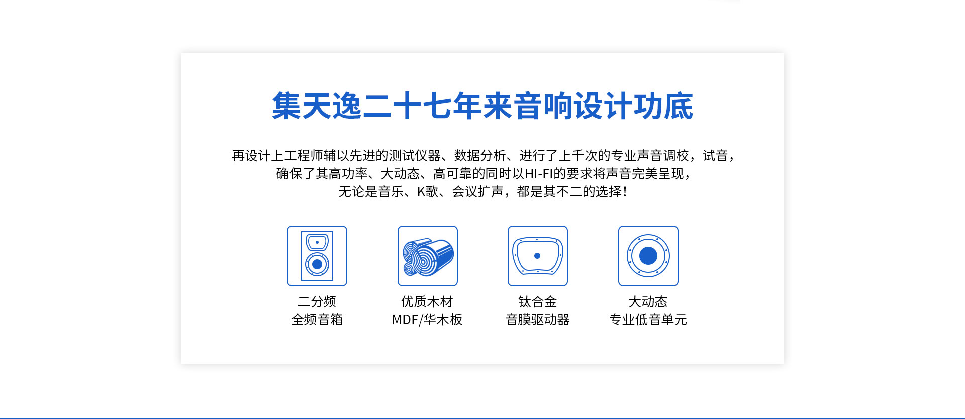 9、采用巴特沃滋滤波器及2分频电路设计,中高频部份斜率为12dB,具有极高的瞬态反应以及最小的相位偏移,金膜电阻、无氧铜线圈电感、高品质的MKP电容保证其音质、音色纯净、甜美。 10、集天逸音响二十五看来音响设计功底,辅以先进的测试仪器、数据分析、进行了上千次的专业声音调校,试音,本箱频响曲线平直,有效频段内起伏小于±3dB,在保证其高功率、大动态、高可靠的同时以HI-FI的要求将声音完美呈现,无论是音乐、K歌、会议扩声,都是其不二的选择; 11、整箱低频弹性十足,瞬态良好,声音的质感明晰、音色温暖醇厚,高频延伸自然、细腻,泛音丰富; 12、输入连接器采用进口小方座(2个并行链接,NL+1/-1,+2/-2)。 二、产品参数 型号:CK-80 系统类型:8"两分频两单元,低频前导向 单元配置:1.7"(高音)×1+8"(低音)×1 频率范围:64Hz-20KHz 灵敏度:95dB 额定阻抗:8Ω 额定输入功率:持续:120W;音乐信号:240W;峰值:480W 最大声压级输出:115dB 交叉频率:1800Hz 覆盖范围:水平50×100°,垂直55° 净 重:10.45Kg/只 毛 重:12.25Kg/只 箱体尺寸:262×427×266mm(宽×高×深) 包装尺寸:336×427502×336mm(宽×高×深) 型号:CK-100 系统类型:10"两分频音箱,低频后导向 单元配置:1.75"(高音)×1+10"(低音)×1 频率范围:55Hz-18KHz 灵敏度:96dB 额定阻抗:6Ω 额定功率:200W 最大功率:350W 最大声压输出:118dB 交叉频率:1800Hz 净重:18.35kg/只 毛重:20.25kg/只 外形尺寸:345×530×346mm(宽×高×深) 包装尺寸:416×605×416mm(宽×高×深) 型号:CK-120 系统类型:12"两分频音箱,低频后导向 单元配置:1.7(高音)"×1+12"(低音)×1 频率范围:50Hz-20KHz 灵敏度:98dB 额定阻抗:6Ω 额定输入功率:持续:250W;音乐信号:500W;峰值:750W 最大声压输出:124dB 交叉频率:1800Hz净 重:21.2kg/只 毛 重:24kg/只 外形尺寸:380×611×400mm(宽×高×深) 包装尺寸:429×686×472mm(宽×高×深) |