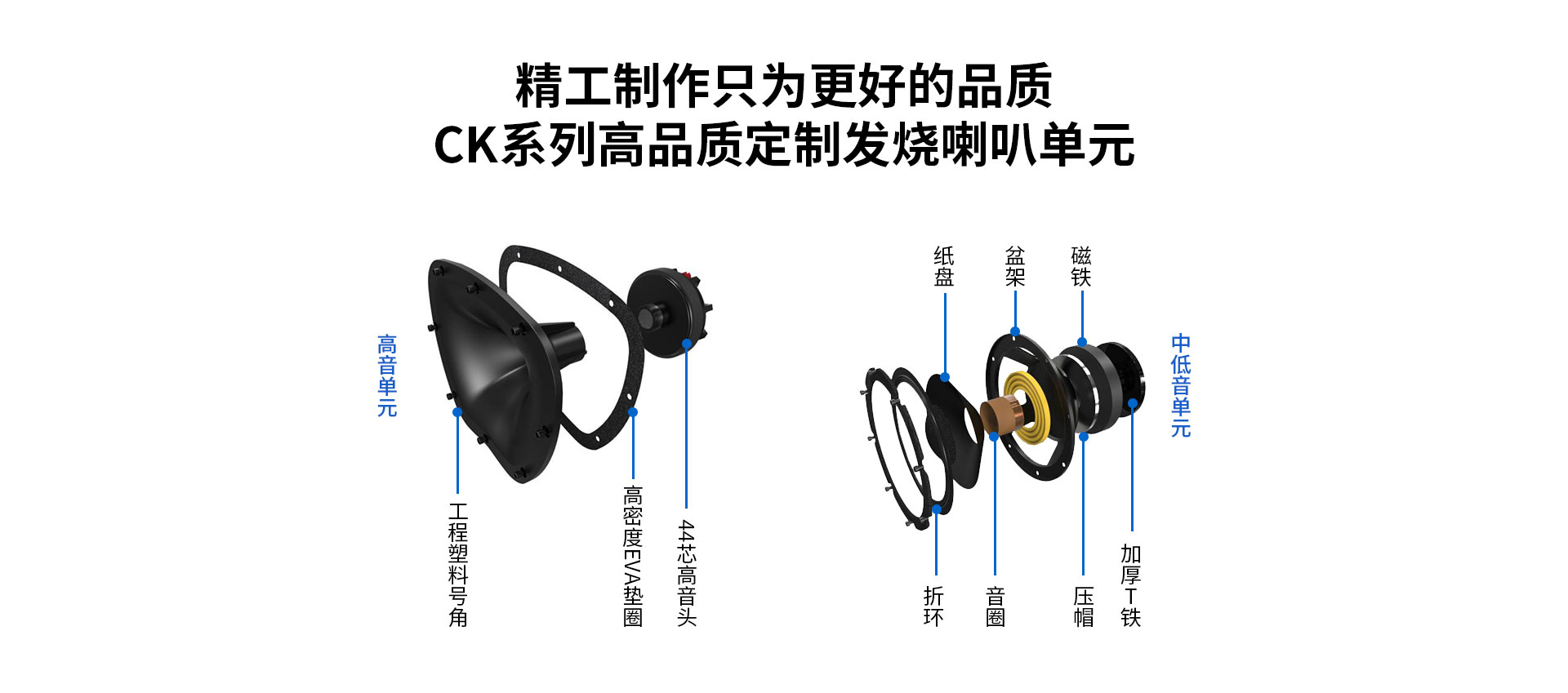 1、天逸最新研发的二分频专业全频音箱CK系列,主要用于娱乐、会议、多功能等扩音场所高品质专业音箱; 2、箱体采用特殊设计的高密度MDF板与进口华木板精密配合加工而成,有效改善音质,让声音的柔和与速度完美结合; 3、箱体结构坚实,强度达到专业工业级水平,表面处理采用高强度黑色耐磨环保涂层,防滑耐磨; 4、高强度钢制冲压一体成型的面罩,有效保护喇叭单元不受外力损坏,内加透声率极高的专业防尘布,不仅美观大方,有效柔化高频毛刺感; 5、特有的多切面设计,任意选择悬挂方式及方向,使系统安装调试更为方便,适用于各种不同的扩声场所; 6、箱体底部配备高强度金属三角支架底座,整箱配置标准M8吊装点;使系统多功能的特性能得到充分的发挥; 7、高音采用特制材料,φ44mm高强度音圈,超轻超薄钛合金音膜,超强大磁钢,全铝合金后盖,使整个高音单元灵敏度,可靠性,高频延伸性更好;特别设计的高音号角,使音箱中高频清晰、通透;高频上限达更是达到18KHz,音质靓丽、甜美、泛音丰富; 8、中低音喇叭单元外绕双层、耐热超导铜线圈,并覆导热涂层,一体成型的超强永磁钢,使单元具有更大、更强的承受功率;W型布边、高解晰度、紧压、轻质纸盆、一体成型高强度铸铝盆架,使整只单元具有极高的钢性,可以有效的降低谐振,轻松实现高效率和大动态的完美结合,使该低音单元具有低失真,高动态、长冲程、大功率等明显优点,喇叭低频下潜深厚、弹性十足。