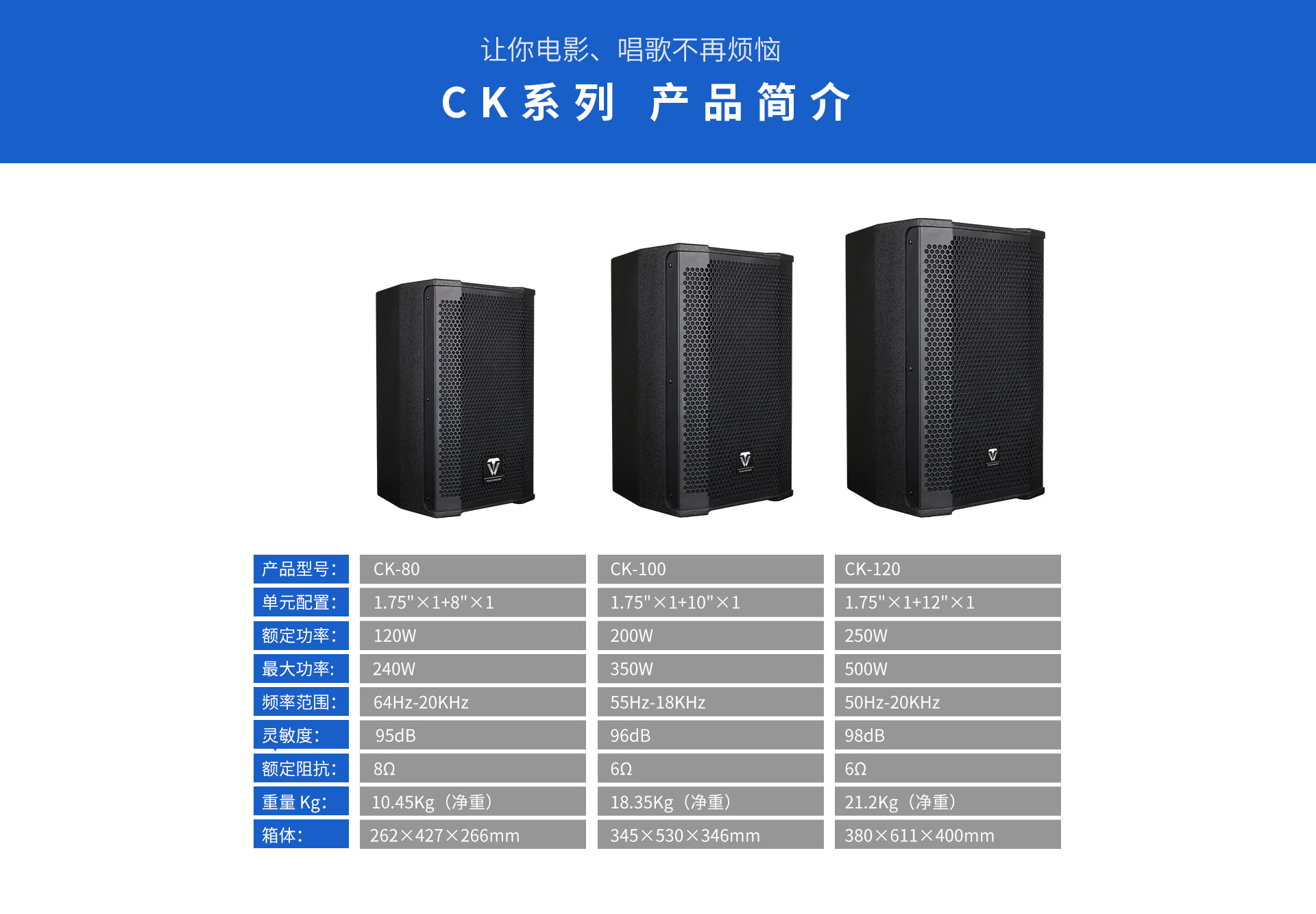 CK系列两分频专业全频音箱 一、整机特点 CK系列是天逸音响为当下市场量身定制的新产品,人声表现突出,中高频通透清晰、层次分明,后倒相式设计,增加低频弹性和下潜深度、低失真、高稳定性;适用范围广,是扩声系统中非常不错的选择。