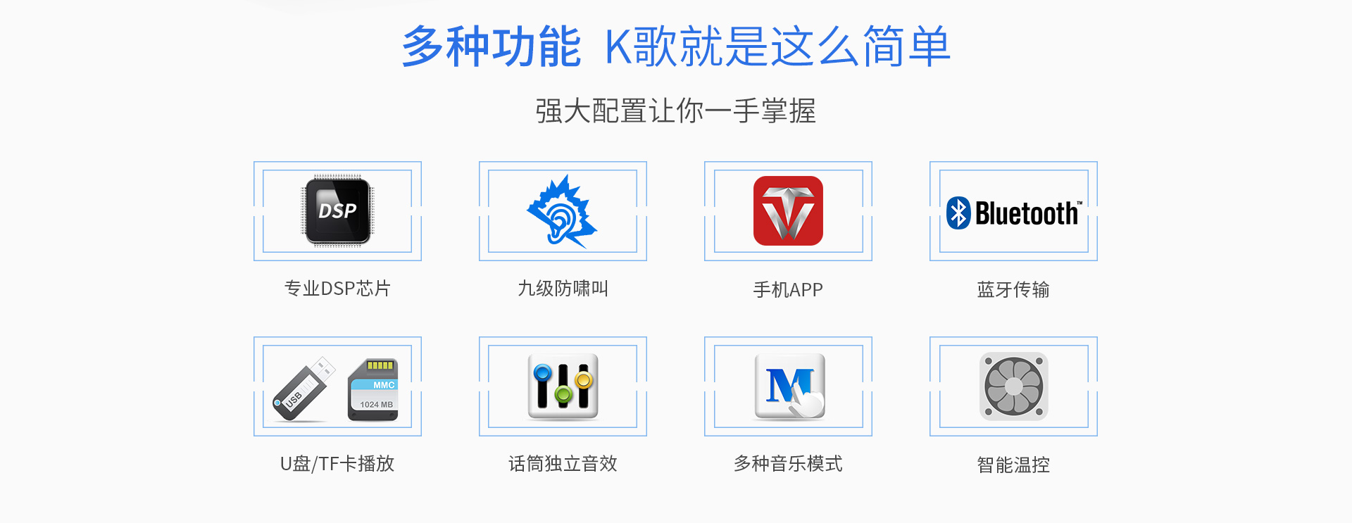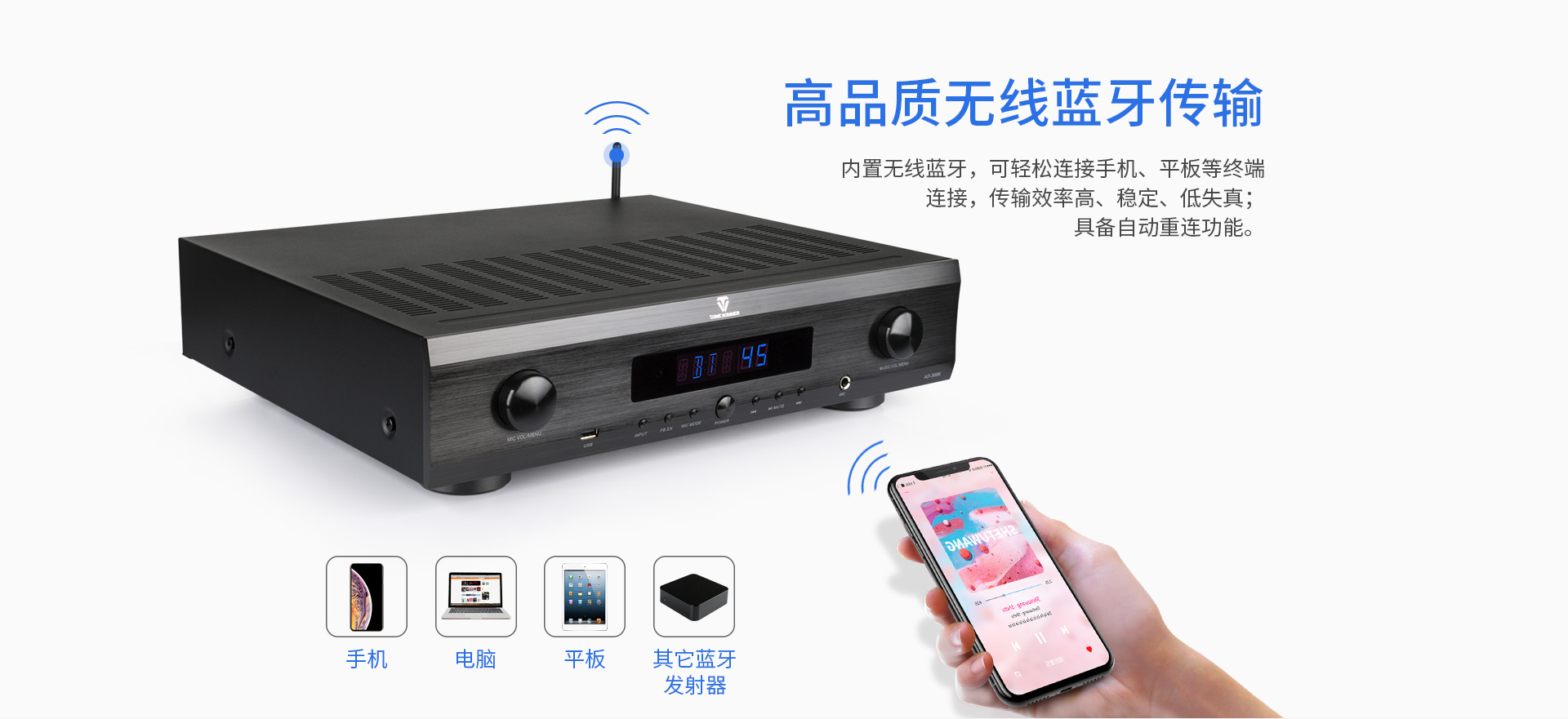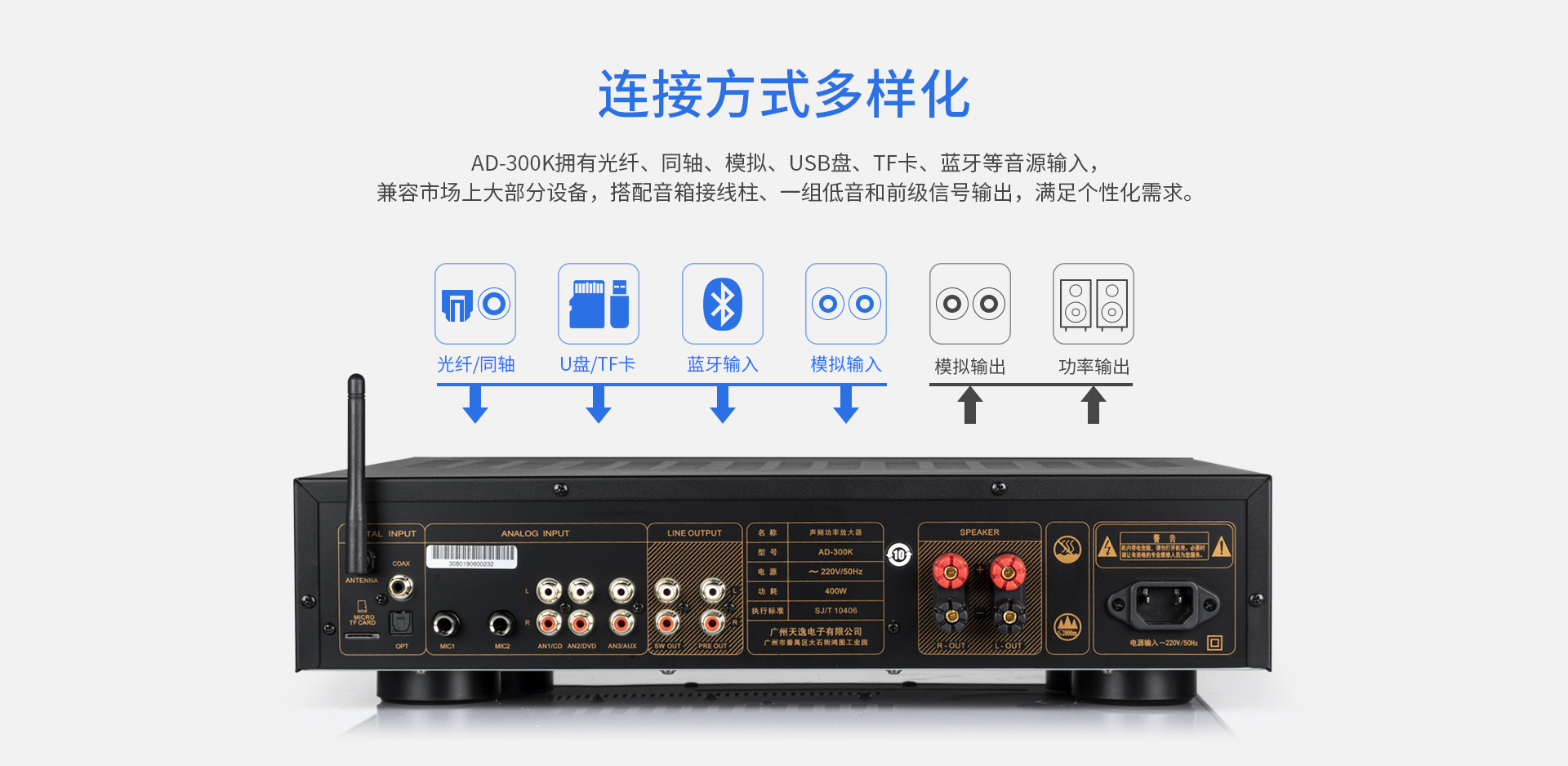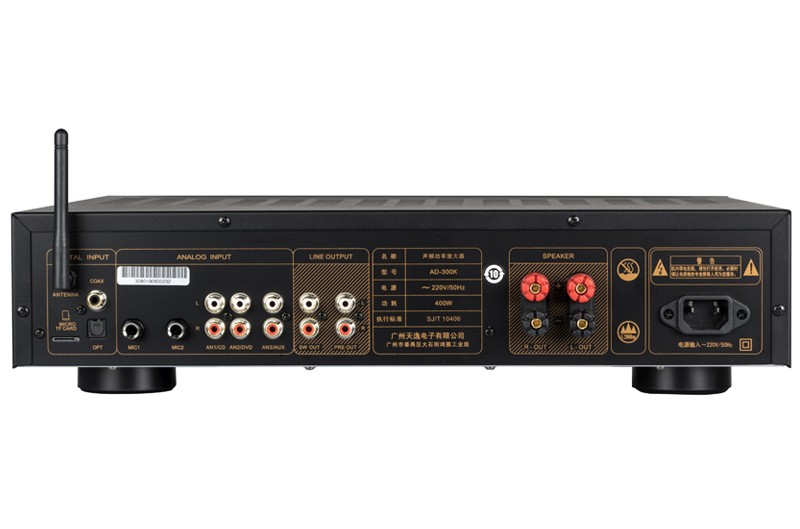产品简述:简介:AD-300K是一款高性能的数字立体声混响和多用图的卡拉OK功放话筒参数包括效果音量、延时时间、EQ等,同时支持U盘、TF卡等高品质音乐本地音乐播放;支持手机APP控制,操作简单方便;是一款应市场需求而特别设计的,可用于多种形式的演唱环境。